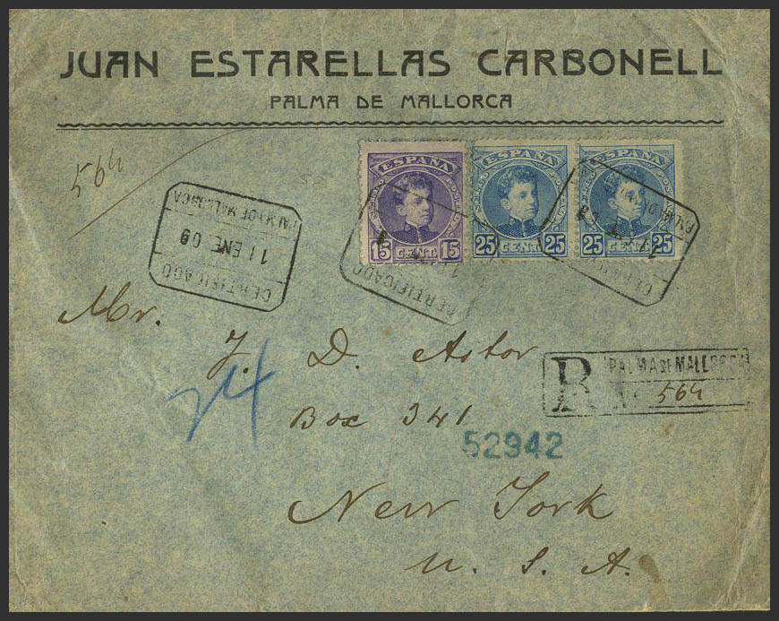 246, 248(2). 1909. 15 cts. y 25 cts., pareja. Certificado de PALMA DE MALLORCA a NEW YORK. MAGNIFICO.