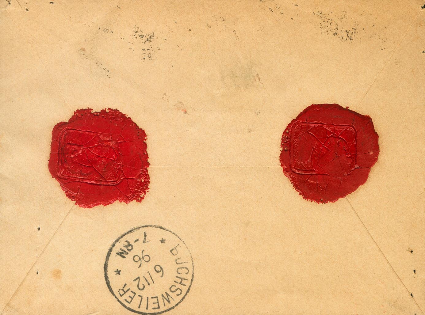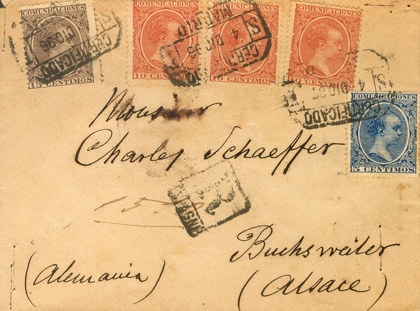 215, 217(3), 219. 1896. 5 cts azul, 10 cts castaño amarillo, tres sellos y 15 cts castaño lila. Certificado de MADRID a BUSCHWEILER (ALSACIA-ALEMANIA). Al dorso llegada. MAGNIFICA Y RARA.