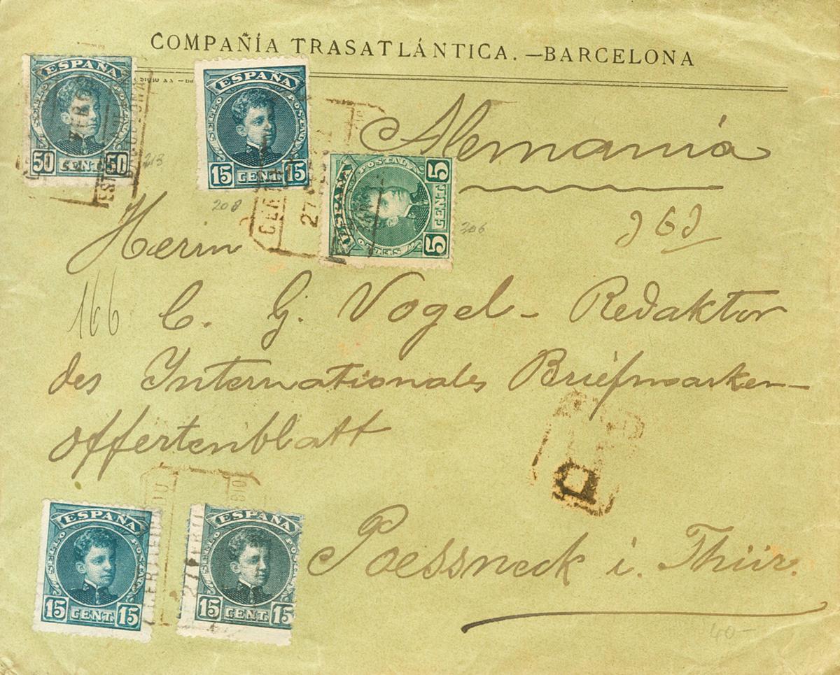 242, 244(3), 252. 1902. 5 cts verde, 15 cts azul, tres sellos y 50 cts azul verdoso. Certificado de BARCELONA a POESSNECK (ALEMANIA). Al dorso lacre de la Compañía Transatlántica y llegada. MAGNIFICA.