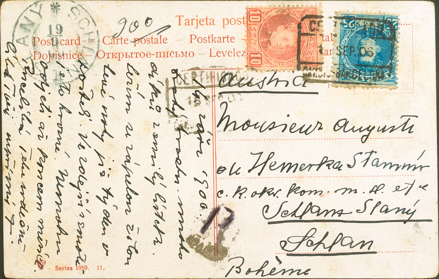 243, 248. 1906. 10 cts rojo y 25 cts azul. Tarjeta Postal Certificada de BARCELONA a SLANY (CHECOSLOVAQUIA). En el frente llegada. MAGNIFICA Y RARA.