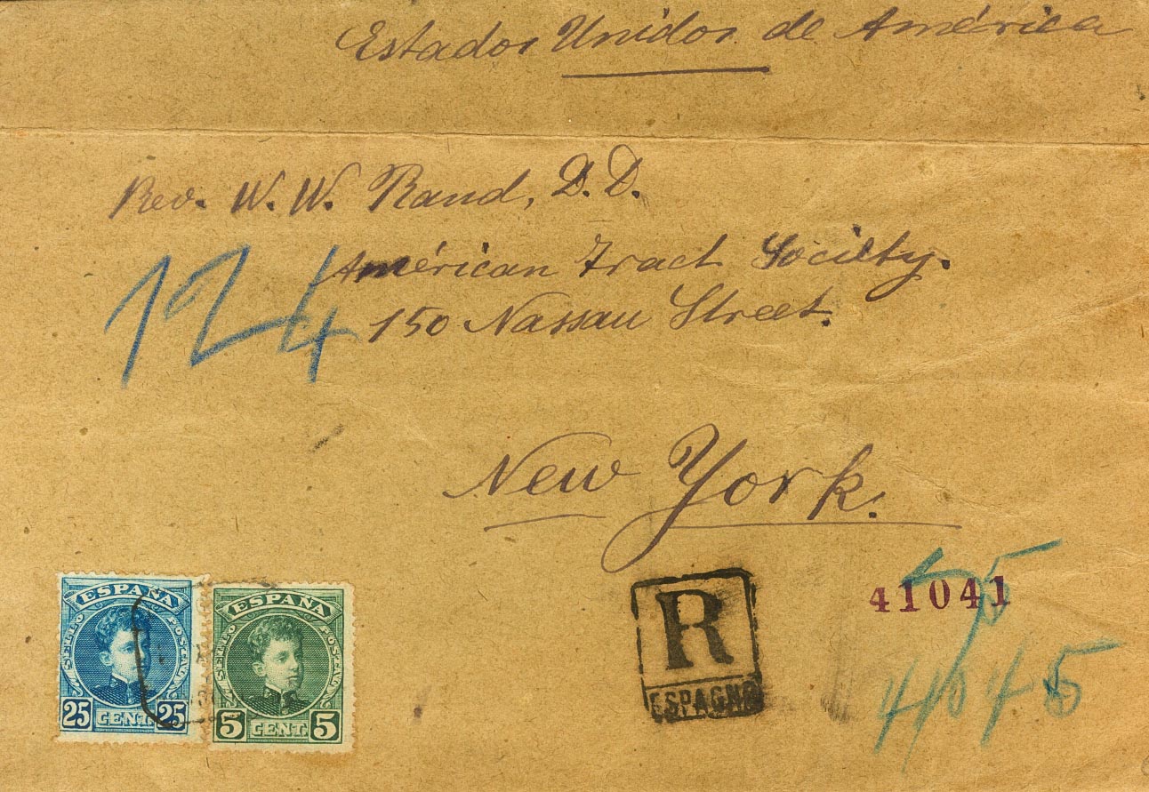 242, 248. 1901. 5 cts verde y 25 cts azul. Faja de Periódico Certificada dirigida a NUEVA YORK (U.S.A.). Al dorso llegada. MAGNIFICA Y MUY RARA.