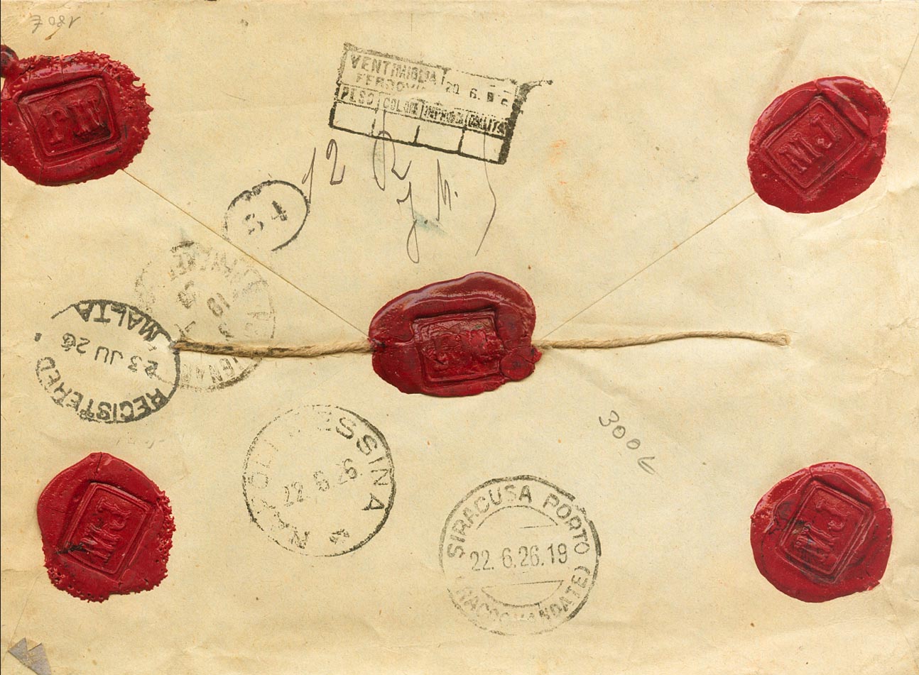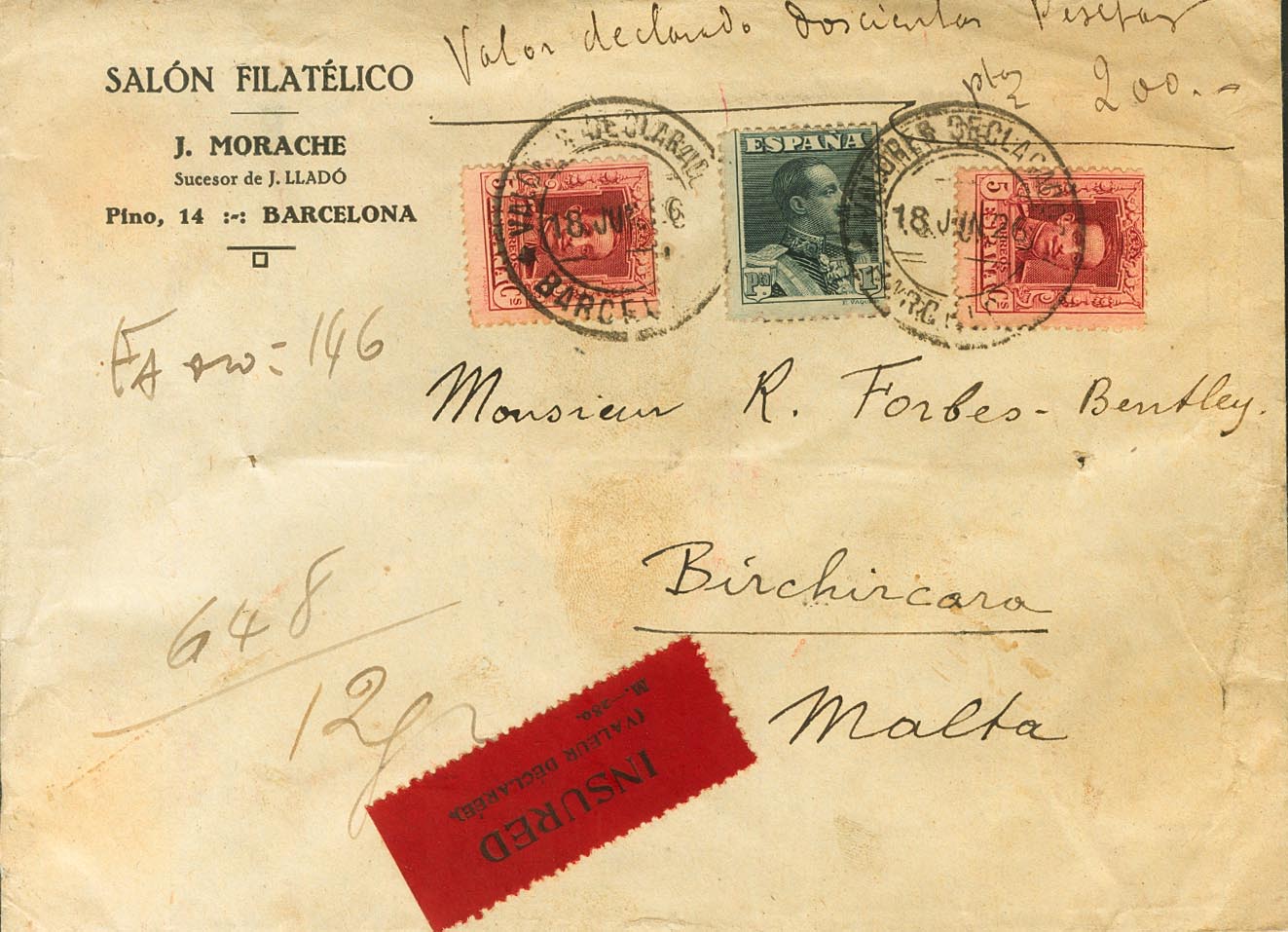 312(2), 321. 1926. 5 cts carmín, dos sellos y 1 pts pizarra. Valores Declarados de BARCELONA a BIRKIRKARA (MALTA). Al dorso tránsitos por Perpiñán, Ventimiglia, Siracusa, Messina y llegada. MAGNIFICA Y MUY RARO DESTINO.