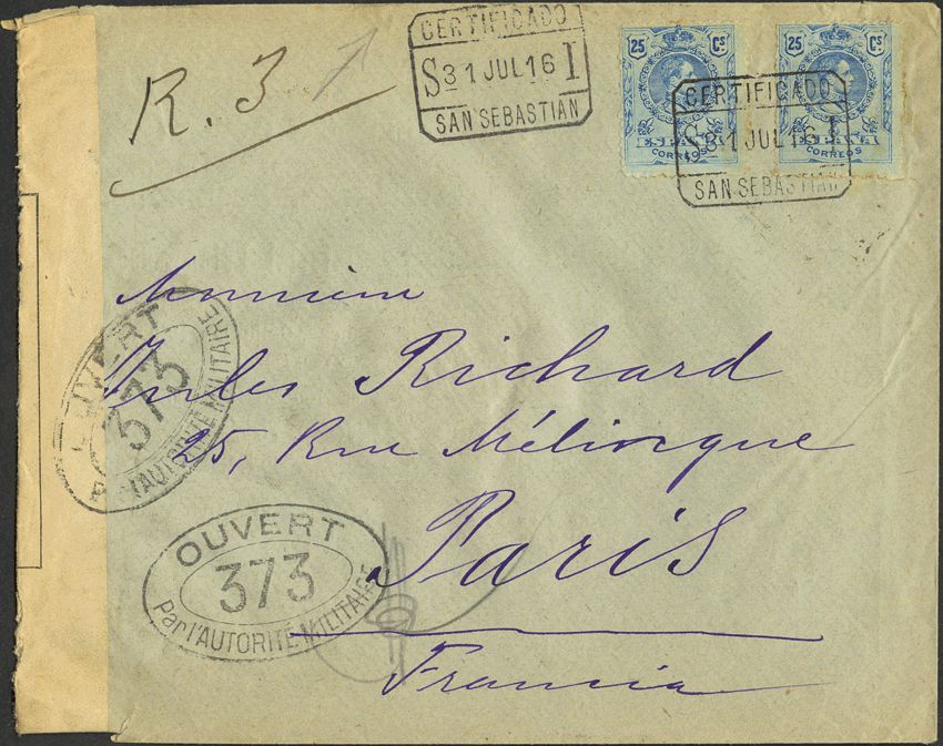 274(2). 1916. 25 cts azul, dos sellos. Certificado de SAN SEBASTIAN a PARIS. MAGNIFICO.