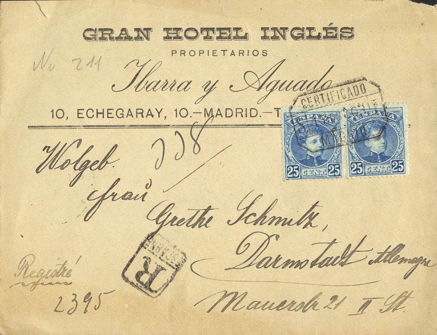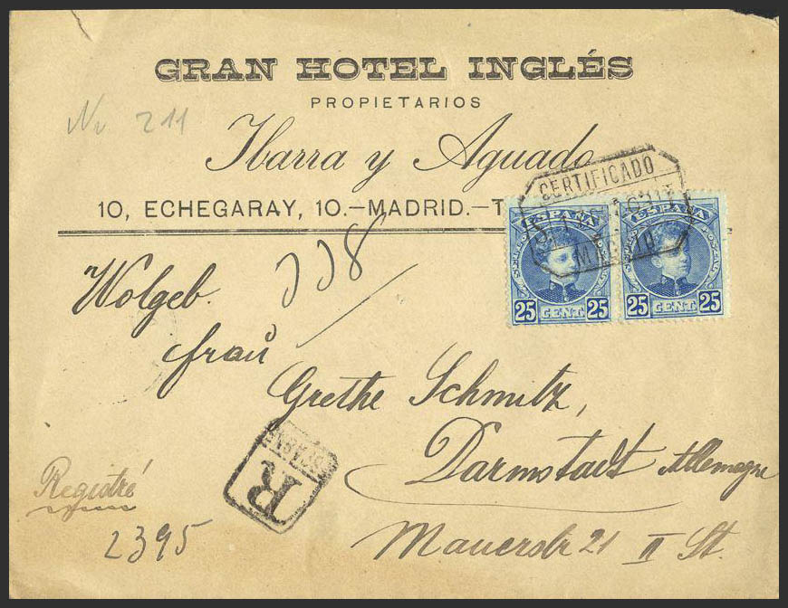 248. 1903. 25 cts azul, pareja. Certificado de MADRID a ALEMANIA. MAGNIFICA.