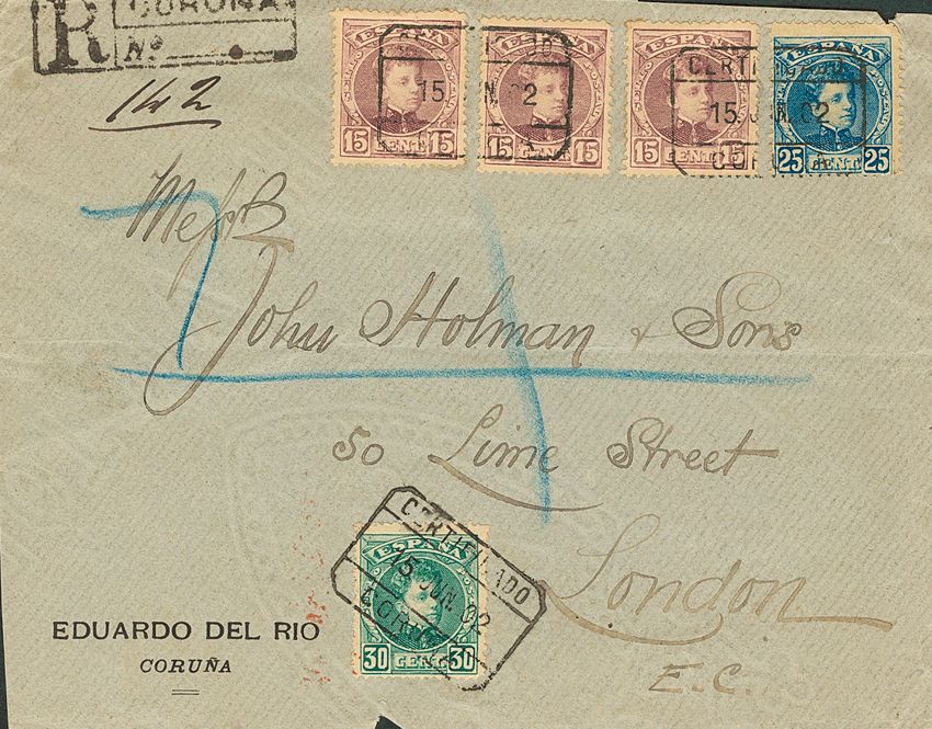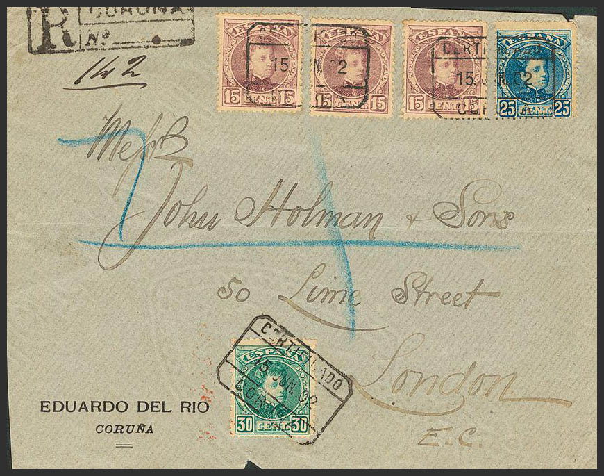245(3), 248, 249. 1902. 15 cts, tres sellos, 25 cts y 30 cts. Frontal de Certificado de CORUÑA a LONDRES (INGLATERRA). MAGNIFICO.