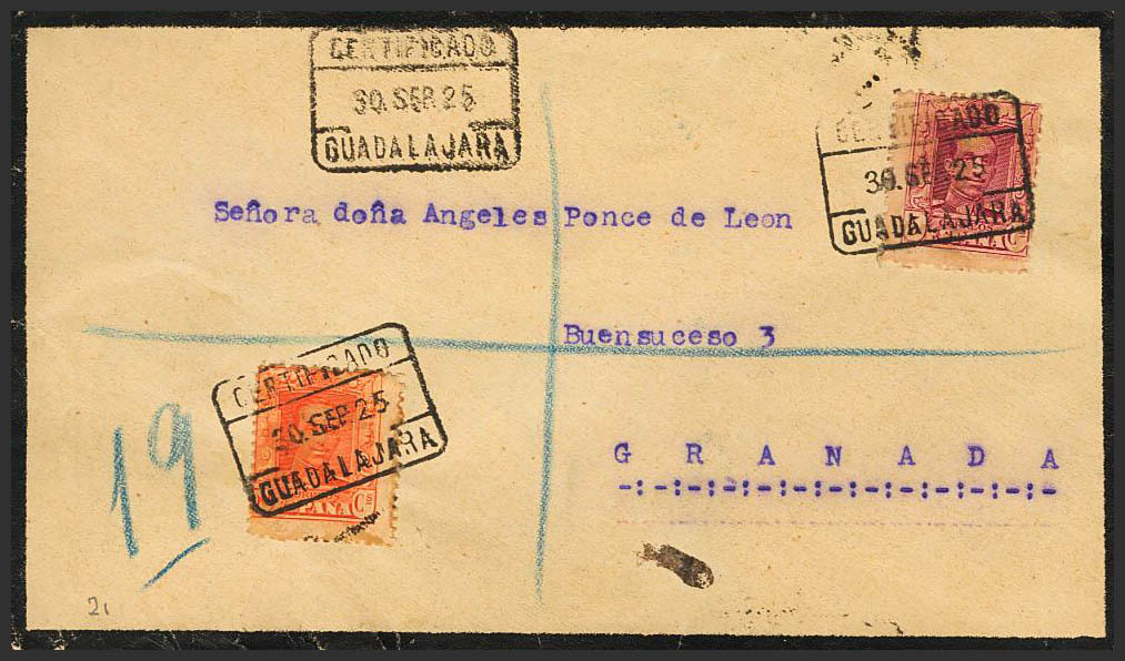 312, 320. 1925. 5 cts y 50 cts. Certificado de GUADALAJARA a GRANADA. Al dorso llegada. MAGNIFICO.
