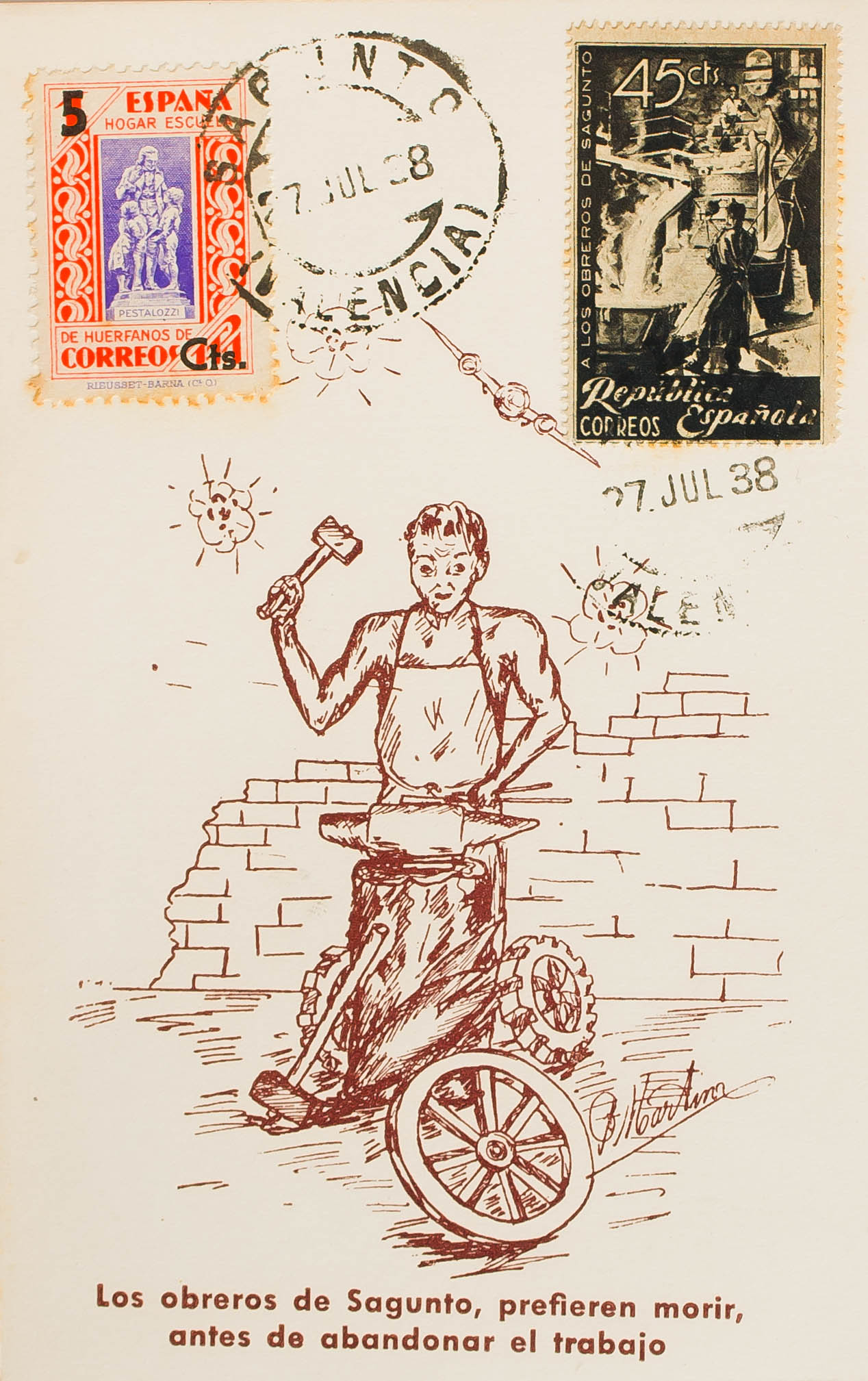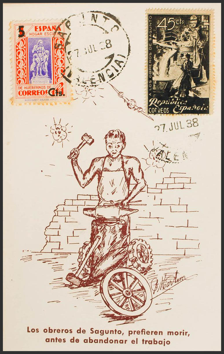 773. 1938. 45 cts negro y sello de Beneficencia. Tarjeta Postal Ilustrada SIN CIRCULAR. Matasello SAGUNTO / VALENCIA. MAGNIFICA.