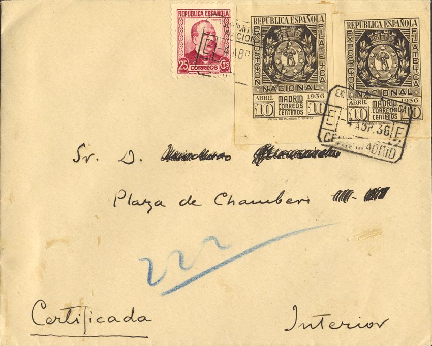727(2), 685. 1936. 25 cts. y 10 cts. dos sellos. Certificado interior de MADRID. MAGNIFICA Y RARA.