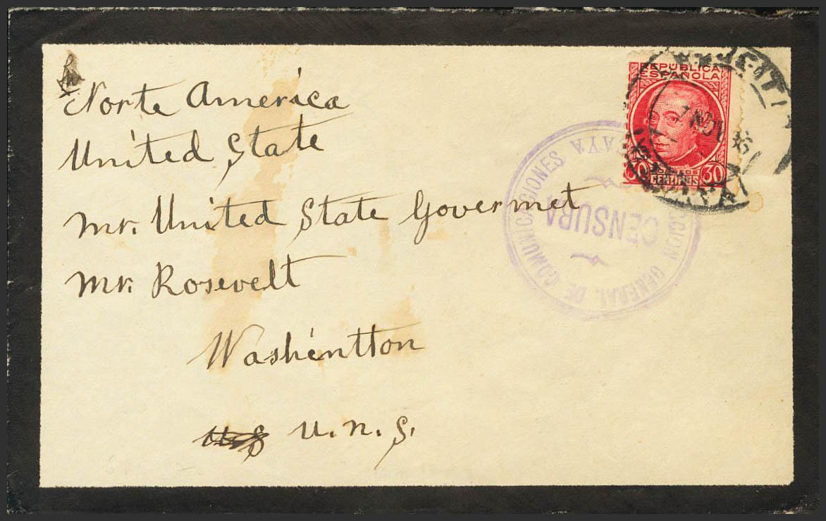 687. 1936. 30 cts carmÃn. Dirigida al Presidente de los Estados Unidos, Franklin D. Roosvelt desde LEQUEITIO (VIZCAYA). Marca de censura DIRECCION GENERAL DE COMUNICACIONES / VIZCAYA, en violeta y al dorso marca FROM THE FRANKLIN D. ROOSEVELT COLLECTION / AUTHENTICATED BY HR HARMERS IC NY, la colección del Presidente americano, un gran coleccionista filatélico, fue subastada en Nueva York por HR Hamers en los años sesenta, empresa que a dÃa de hoy continúa su exitosa carrera filatélica, son escasÃsimas las piezas españolas incluÃdas en la colección Roosvelt, y esta obviamente proceden de su propio archivo de correspondencia. MAGNIFICA Y PIEZA DE ENORME INTERES HISTORICO PROCEDENTE DE UNO DE LOS PRESIDENTES AMERICANOS CON MAS INCIDENCIA EN LA HISTORIA.