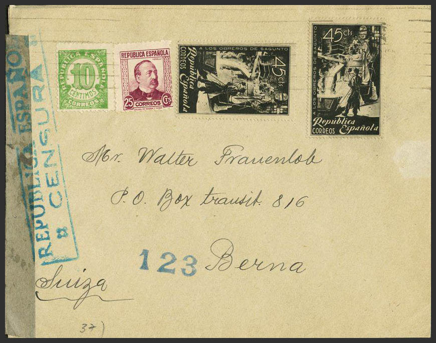 773(2). (1938ca). 45 cts negro, dos sellos. BARCELONA a SUIZA. MAGNIFICA.