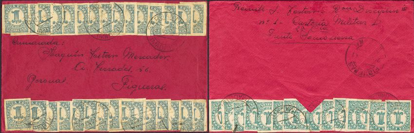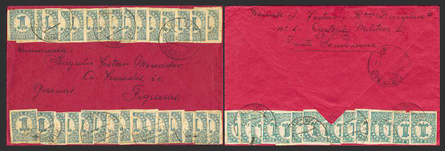 677(15). 1938. 1 cts, cuarenta y cinco sellos, quince de ellos al dorso. FRENTE DE SOMOSIERRA a FIGUERAS. Al dorso llegada. MAGNIFICA.