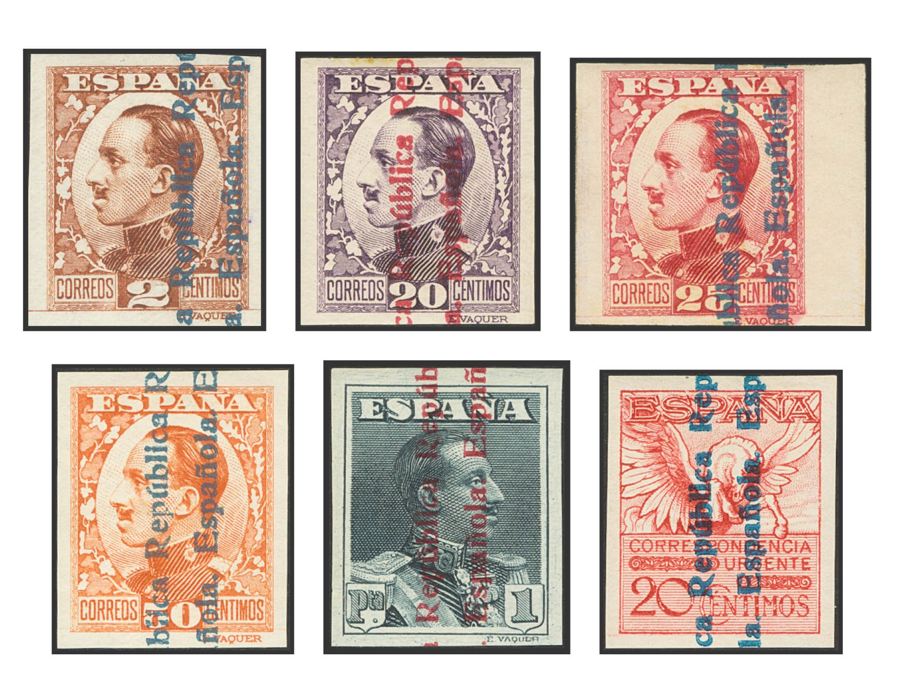 ★ 593/03s. 1931. Serie completa, seis valores. SIN DENTAR (el catálogo Edifil menciona la existencia de los valores 5 cts y 15 cts, que son los que precisamente faltan y de los cuales estamos convencidos de su inexistencia). MAGNIFICA Y RARISIMA.