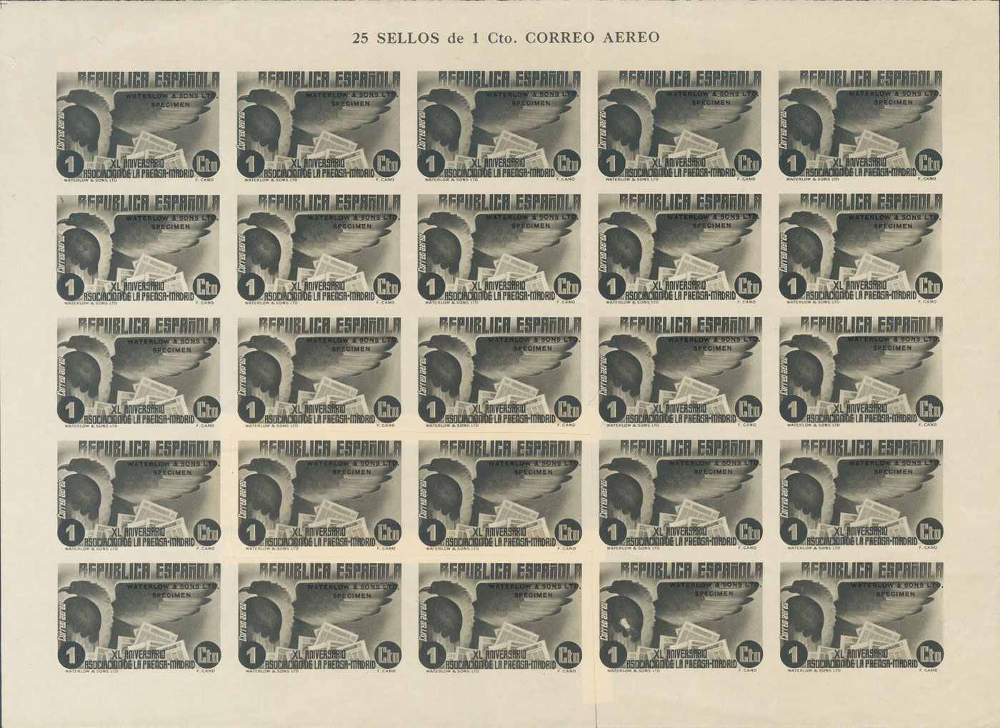 ★★ 711P(25). 1936. 1 cts negro, hoja de veinticinco sellos (una pareja recortada e integrada de nuevo en el pliego). ENSAYO DE COLOR, en negro y WATERLOW AND SONS LTD / SPECIMEN. MAGNIFICA Y EXTRAORDINARIAMENTE RARA, SIN DUDA PIEZA DE ENORME IMPORTANCIA Y ESPECTACULARIDAD.