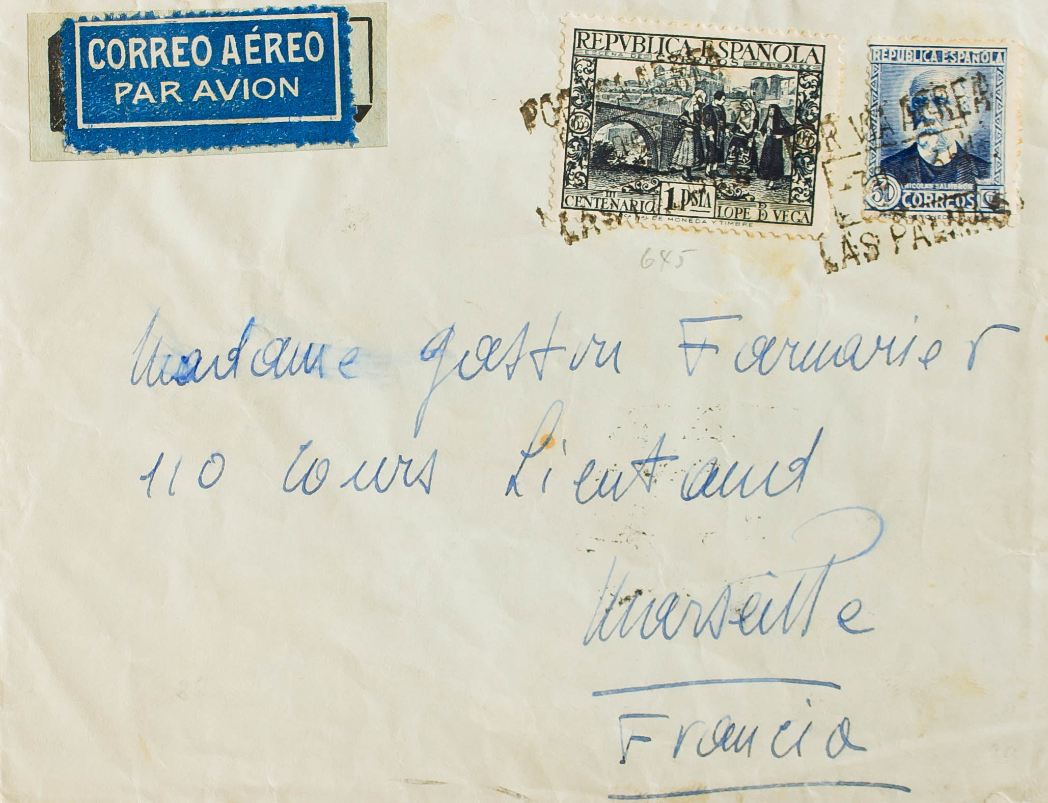 693, 688. . 50 cts azul y 1 pts pizarra. LAS PALMAS a MARSELLA. Al dorso llegada. MAGNIFICA.