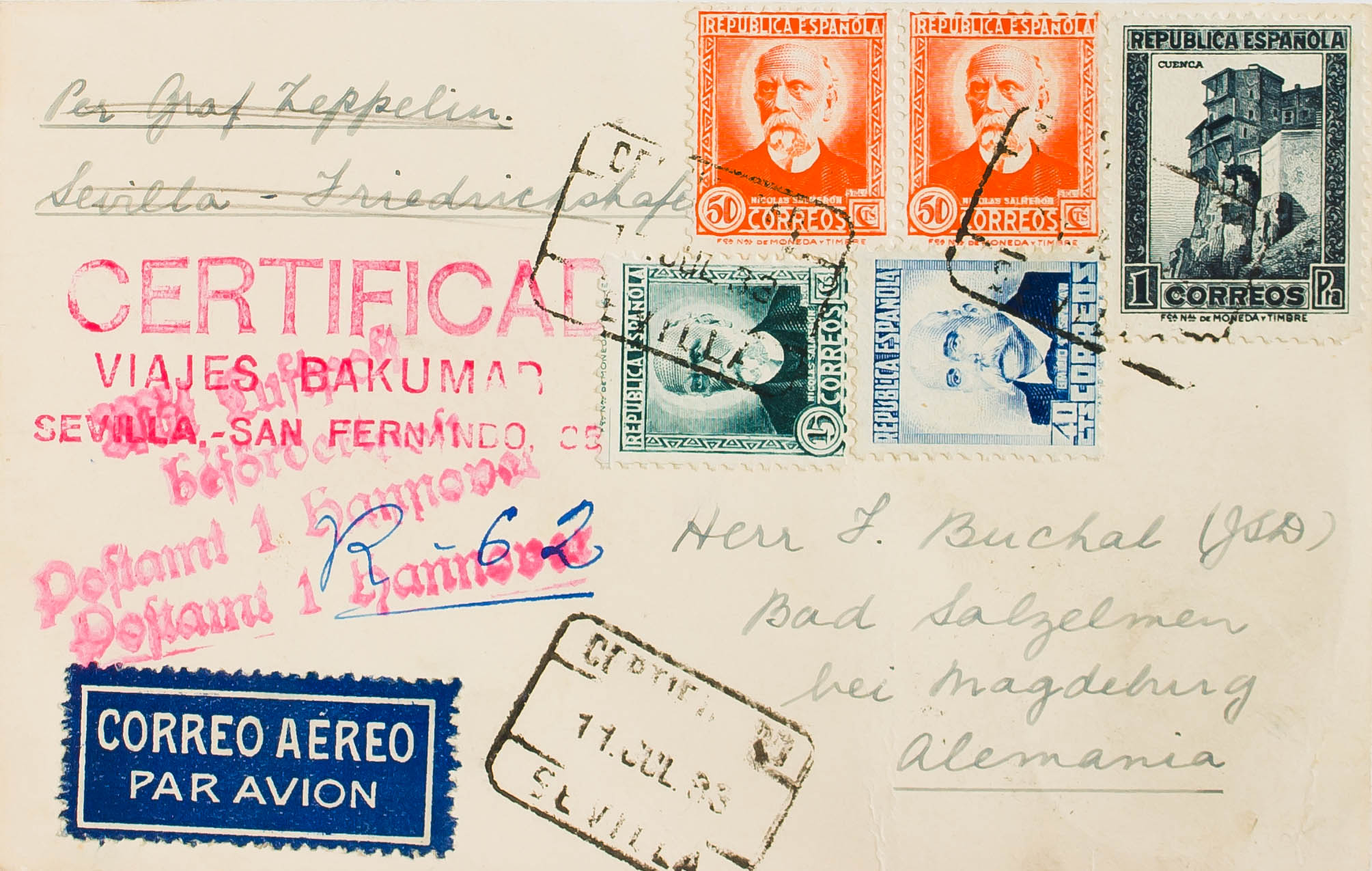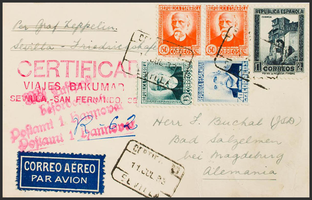 665, 670, 671(2), 673. 1933. 15 cts, 40 cts, 50 cts, dos sellos y 1 pts. Tarjeta Postal Certificada de SEVILLA a MAGDEBURGO (ALEMANIA). En el frente "Per Graf Zeppelin" anulado y enviado por correo aéreo, al dorso llegada. MAGNIFICA.
