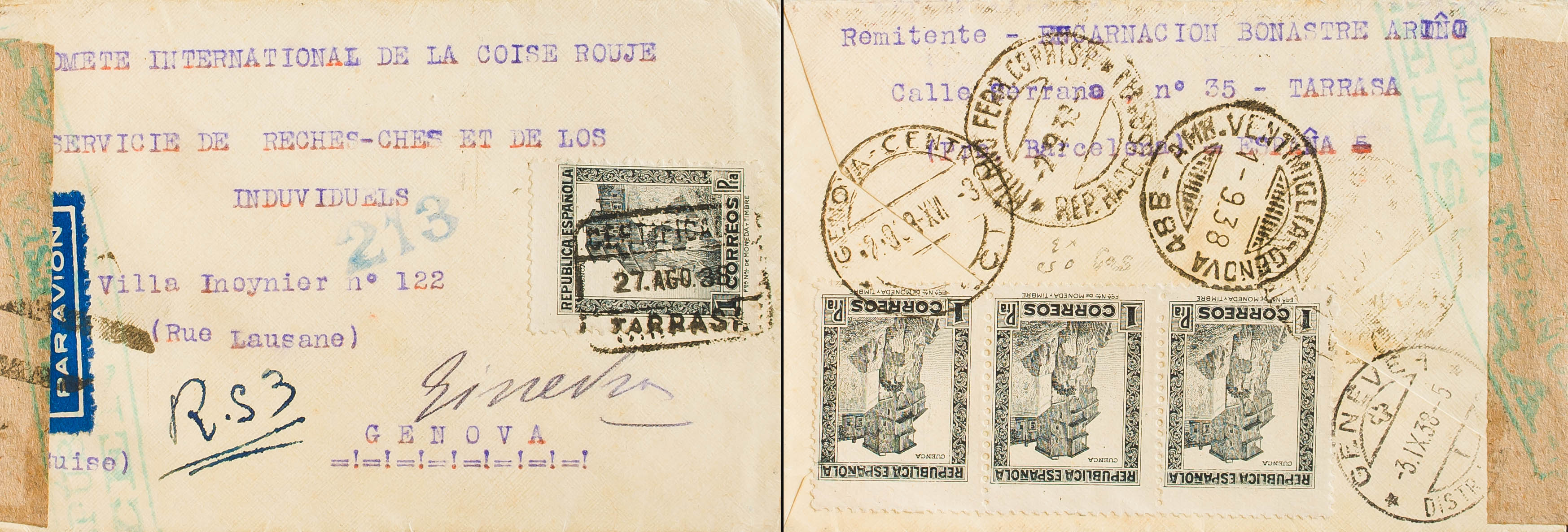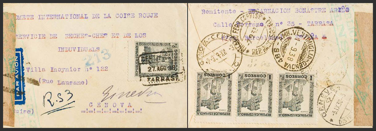 673(4). 1938. 1 pts pizarra, cuatro sellos (tres al dorso). Certificado de TARRASA a GENOVA, reexpedida a su destino correcto GINEBRA (SUIZA). El remitente indicó la dirección correcta en Génova en lugar de Ginebra, al dorso llegada y diferentes tránsitos. MAGNIFICA E INUSUAL.