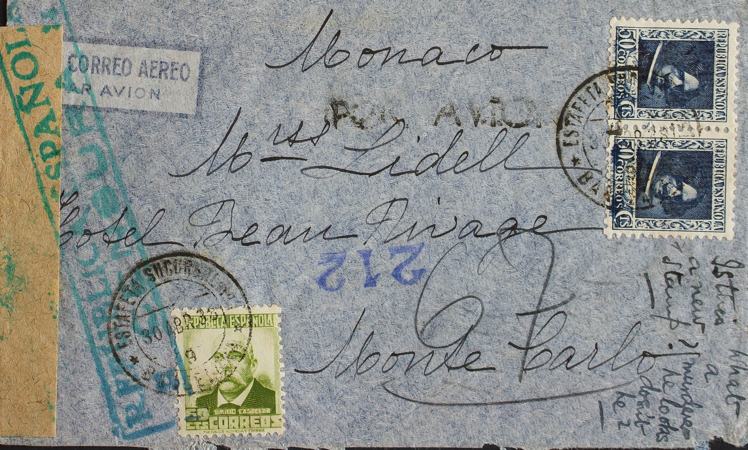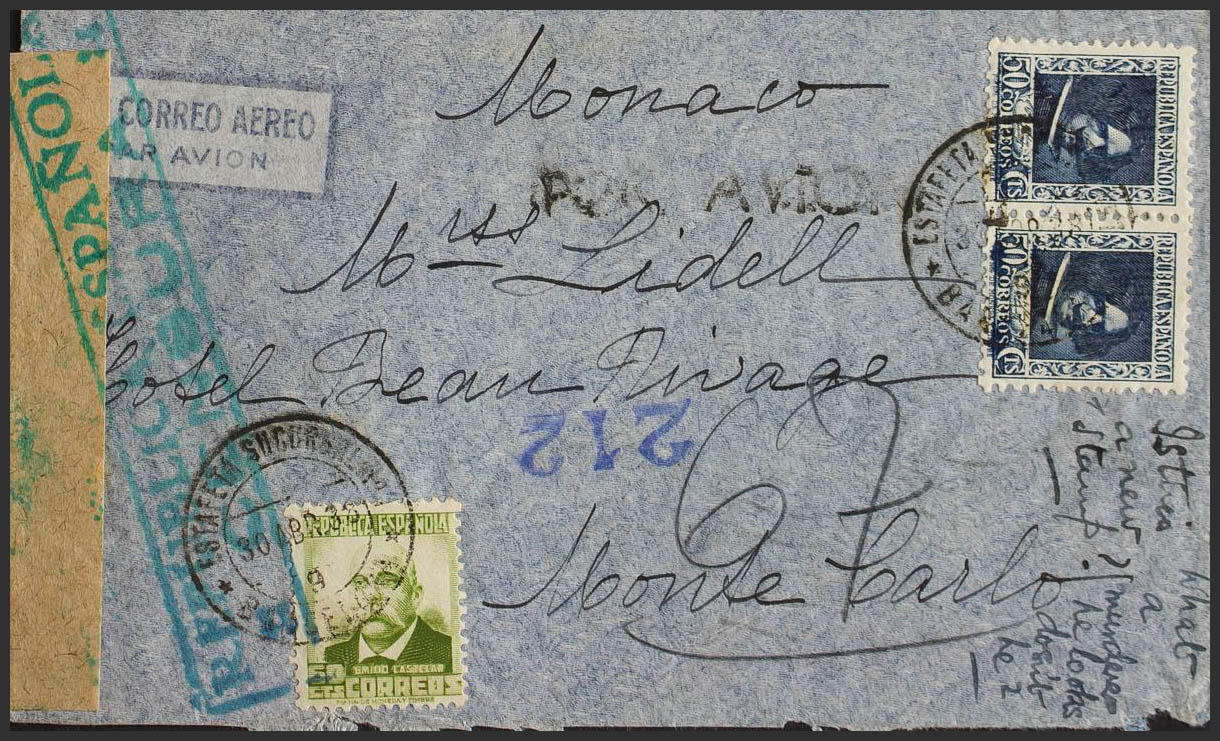 738, 674. 1938. 50 cts azul, pareja y 60 cts oliva. BARCELONA a MONTE-CARLO (MONACO). Al dorso llegada. MAGNIFICA Y MUY RARO DESTINO.