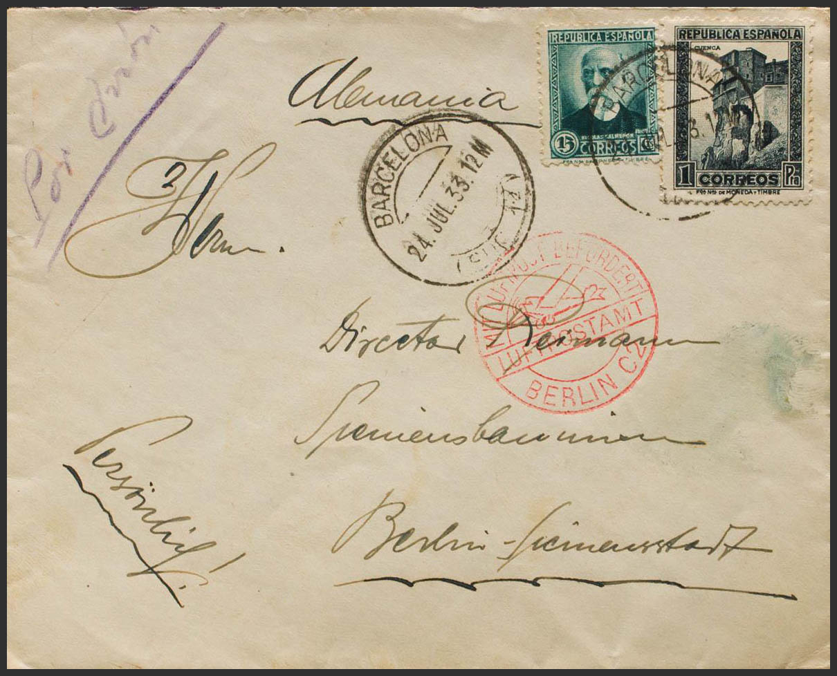 665, 673. 1933. 15 cts verde gris y 1 pts pizarra. BARCELONA a BERLIN (ALEMANIA). En el frente marca de llegada MIT LUFTPOST BEFORDERT / LUFTPOSTAMT / BERLIN C2, en rojo. MAGNIFICA.