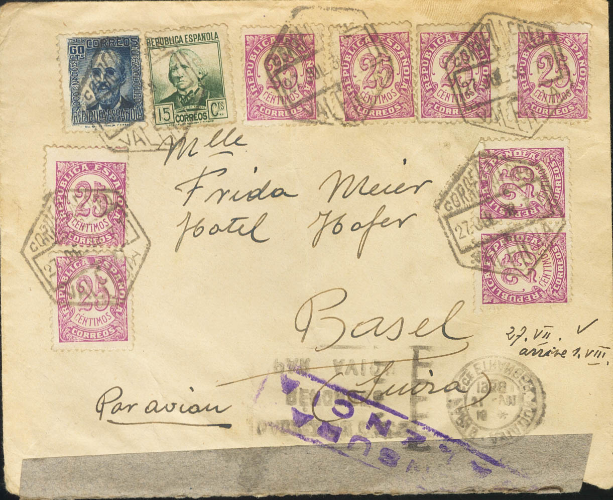 733, 739, 749(8). 1938. 15 cts verde, 60 cts azul y 25 cts lila, ocho sellos. VALENCIA a BASILEA (SUIZA). Al dorso tránsito París. MAGNIFICA.