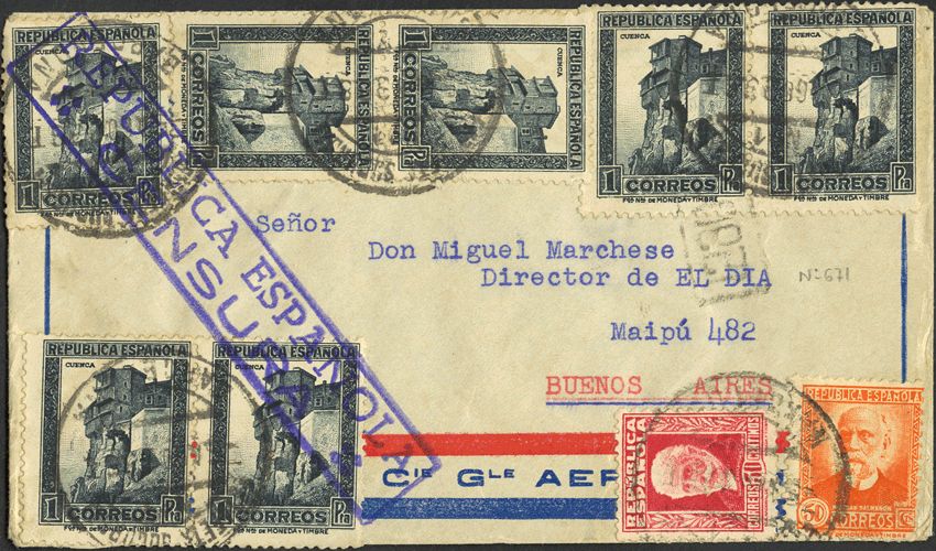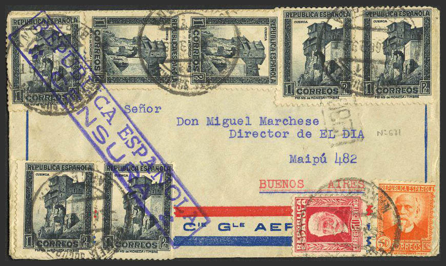 770(7),669,671. 1938. Dirigido a BUENOS AIRES. 30 cts, 50 cts y 1 pts, tres parejas y un sello. Matasello ESTAFETA DE CAMBIO / BARCELONA, tranportada "POR CORREO AEREO". MAGNIFICA Y RARA.
