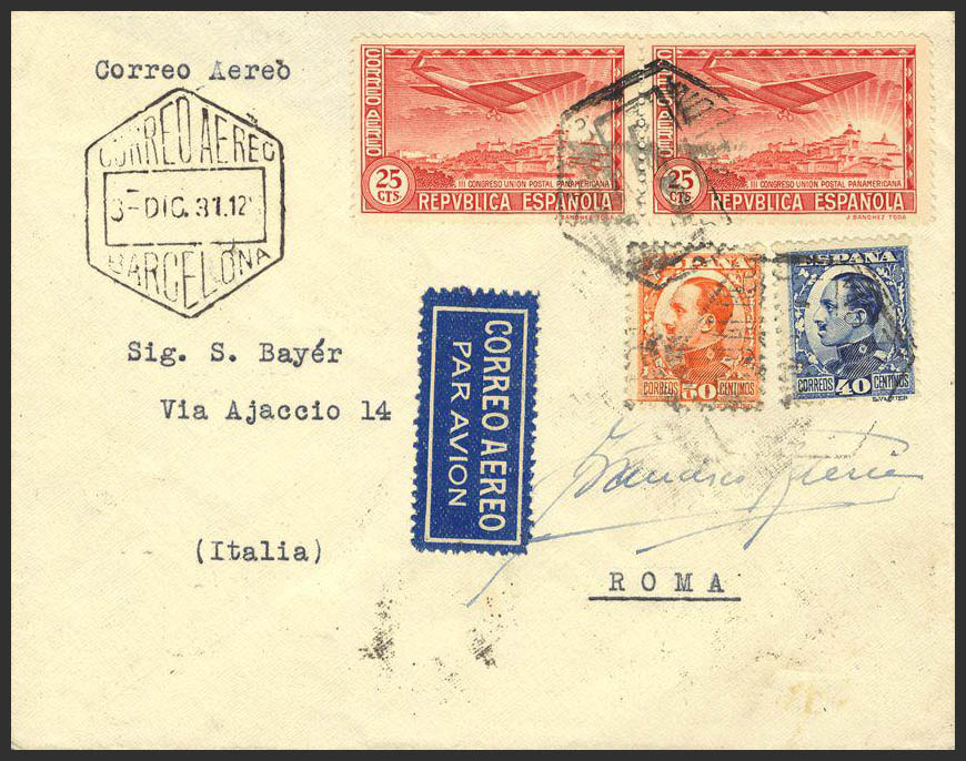497, 498, 616(2). 1931. 25 cts., pareja, 40 cts. y 50 cts. BARCELONA a ROMA (ITALIA). Matasello CORREO AEREO / BARCELONA, al dorso llegada. MAGNIFICA.