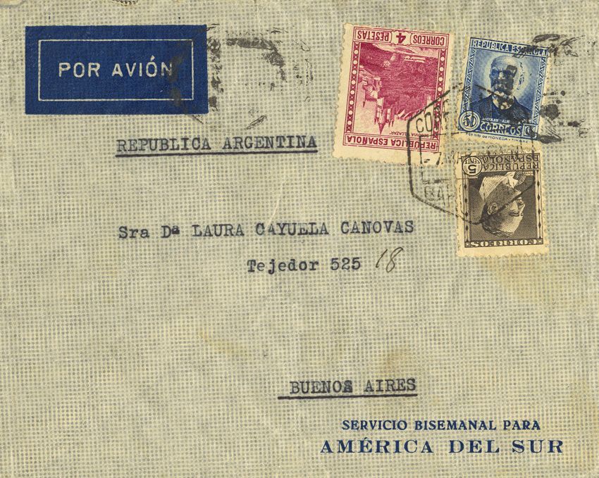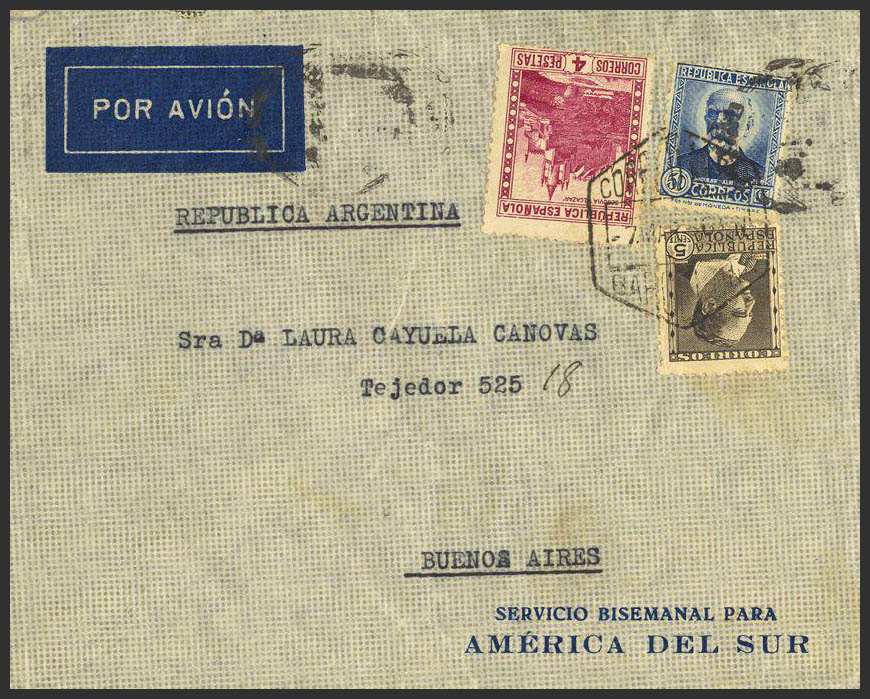 674, 681, 688. 1936. 5 cts., 50 cts. y 4 pts. BARCELONA a BUENOS AIRES (ARGENTINA). Matasello CORREO AEREO / BARCELONA. MAGNIFICA.
