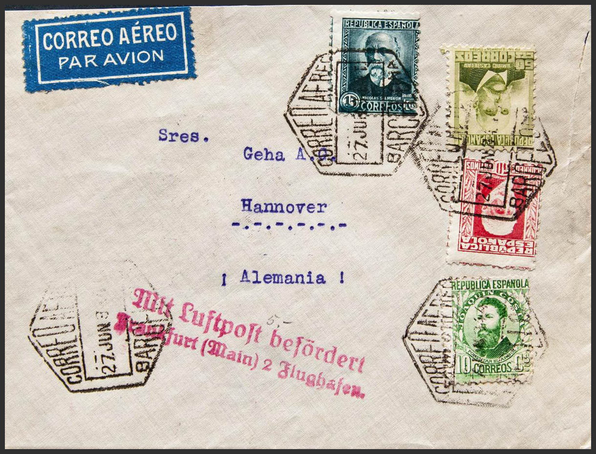 República Española Correo Aéreo. Al dorso MENSAJERIAS BARCELONA. MAGNIFICA Y RARA.