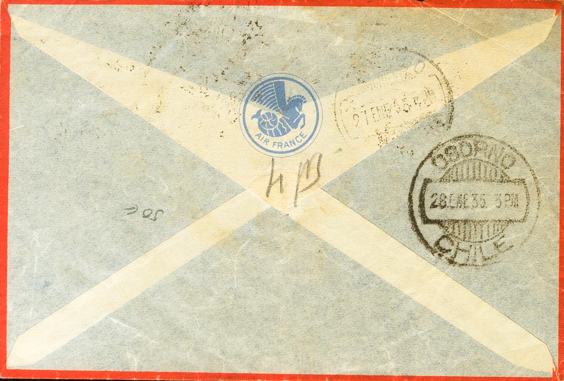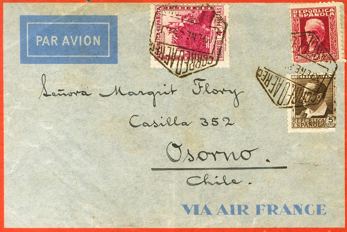667, 674, 681. 1935. 25 cts carmín, 4 pts lila rosa y 5 cts castaño negro (un sello desprendido). BARCELONA a OSORNO (CHILE). Al dorso llegada. MAGNIFICA E INUSUAL DESTINO.