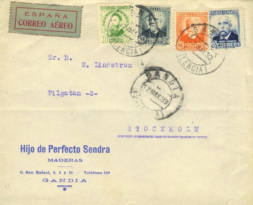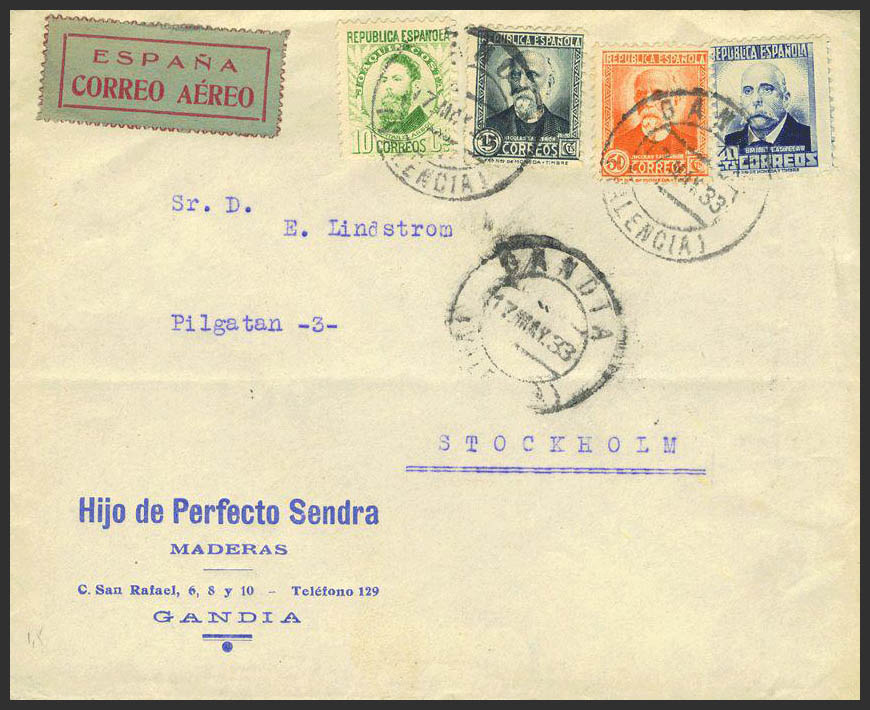 664, 651, 670, 671. 1933. 10 cts, 15 cts, 40 cts y 50 cts. GANDIA a ESTOCOLMO. Al dorso tránsito por ParÃs. MAGNIFICA.