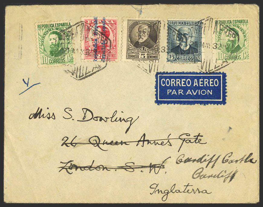 República Española Correo Aéreo. CORREO AEREO / SEVILLA, al dorso llegada. MAGNIFICA.