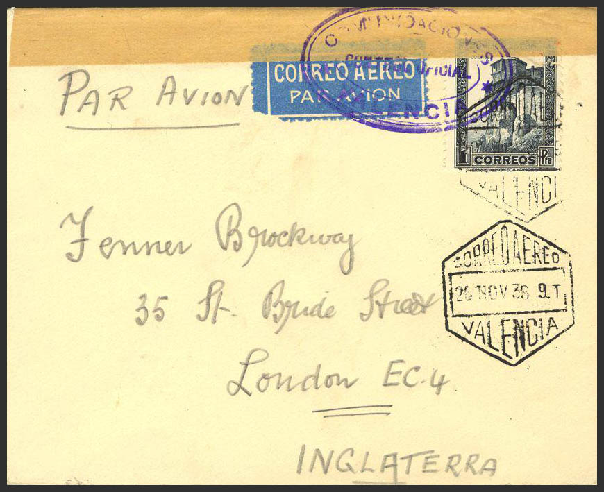 República Española Correo Aéreo. CORREO AEREO / VALENCIA. MAGNIFICA.