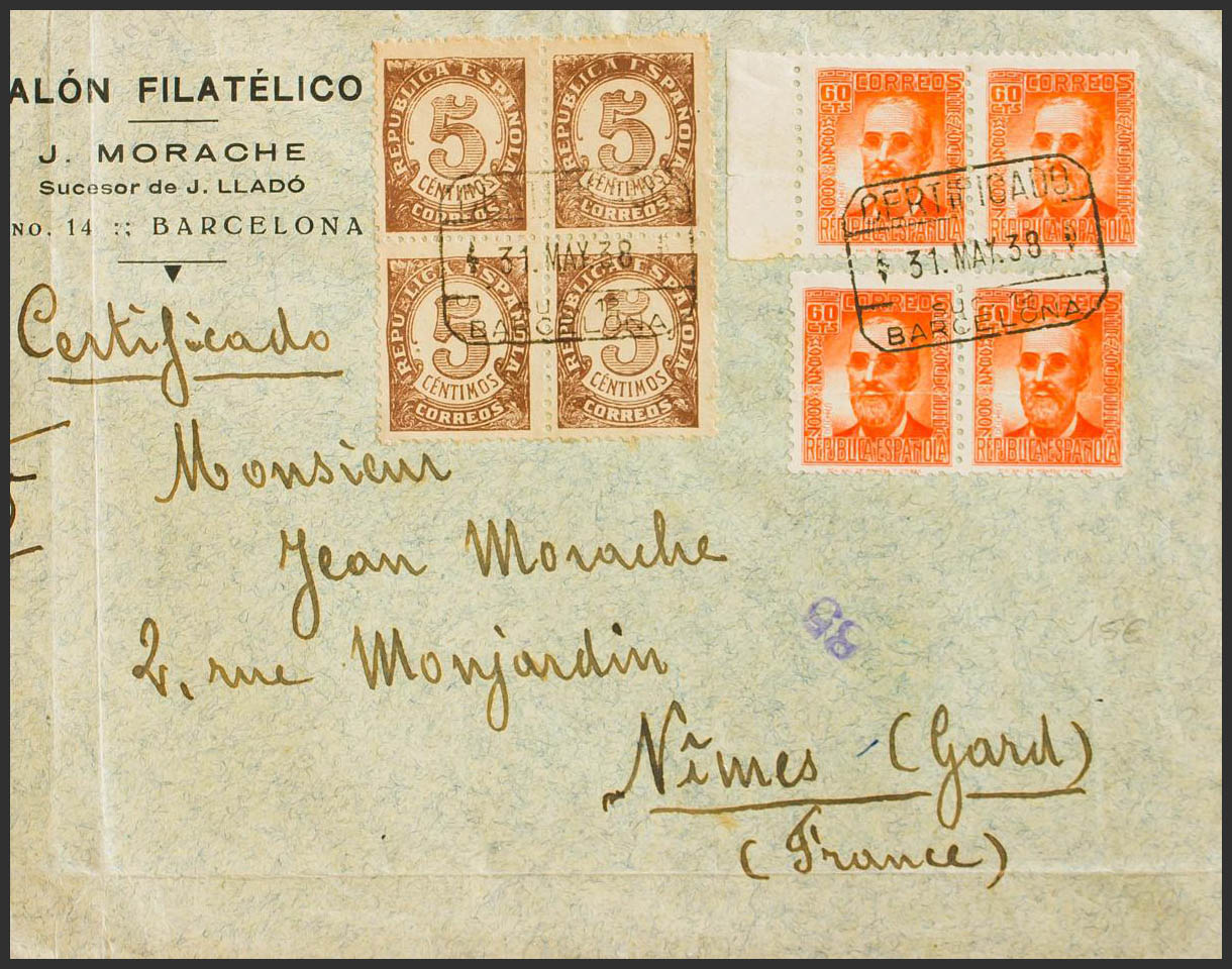 740(4), 745(4). 1939. 60 cts naranja, cuatro sellos y 5 cts castaño, cuatro sellos. Certificado de BARCELONA a NIMES (FRANCIA). Al dorso llegada. MAGNIFICA Y MUY RARO FRANQUEO CON EL 60 CTS NARANJA, EN BLOQUE DE CUATRO.