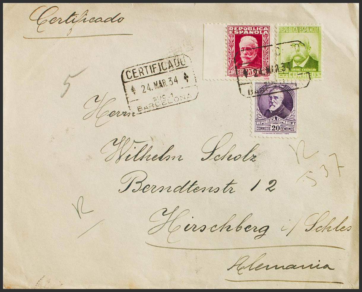 República Española Correo Certificado. Al dorso llegada. ESPECTACULAR FRANQUEO.