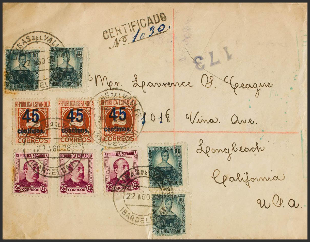 685(3), 732(4), 744(3). 1938. 25 cts carmín, tres sellos, 10 cts verde azul, cuatro sellos y 45 cts sobre 2 cts castaño, tres sellos. Certificado de LLINAS DEL VALLE (BARCELONA) a LONG BEACH (U.S.A.). Al dorso tránsitos y llegada. MAGNIFICA.