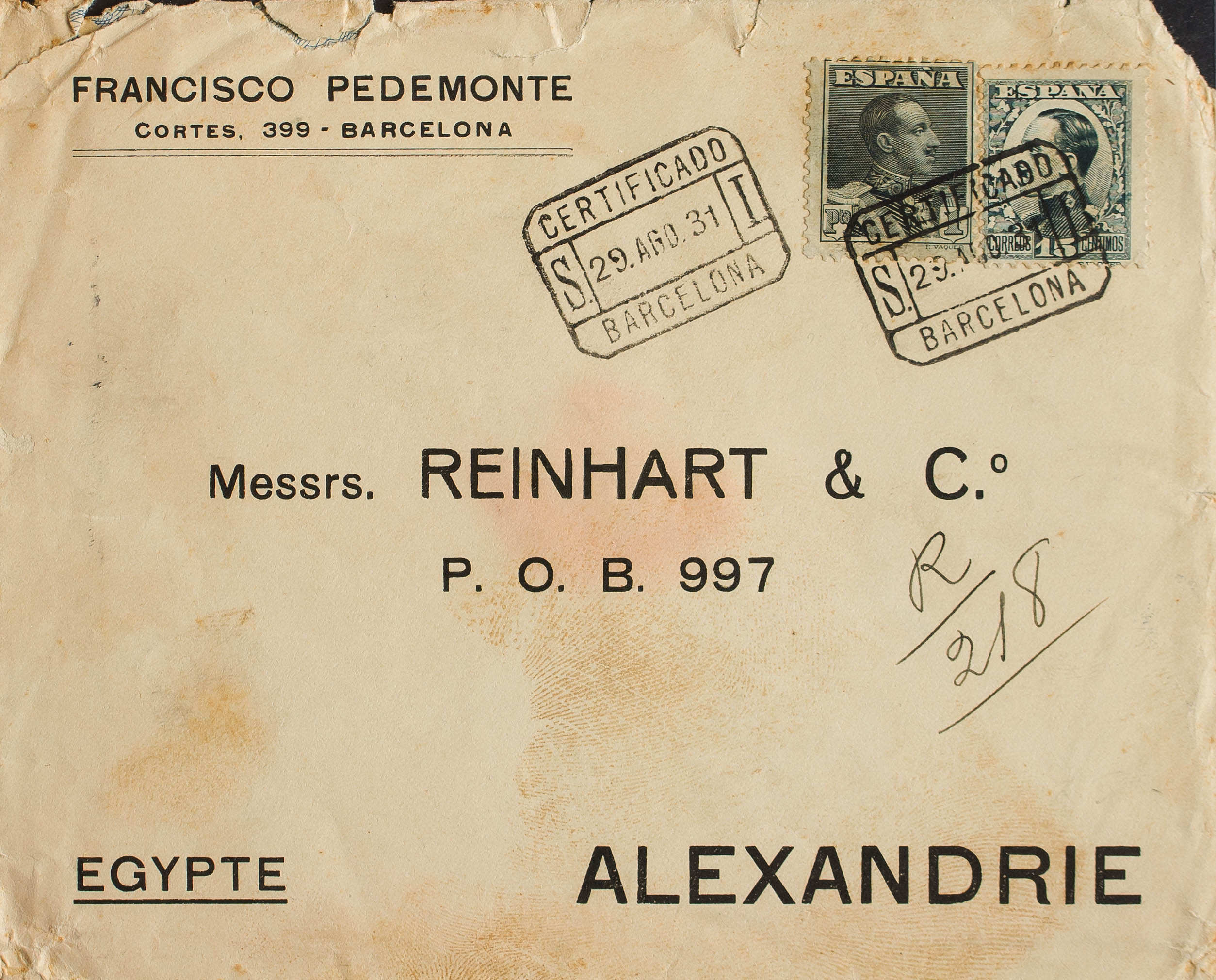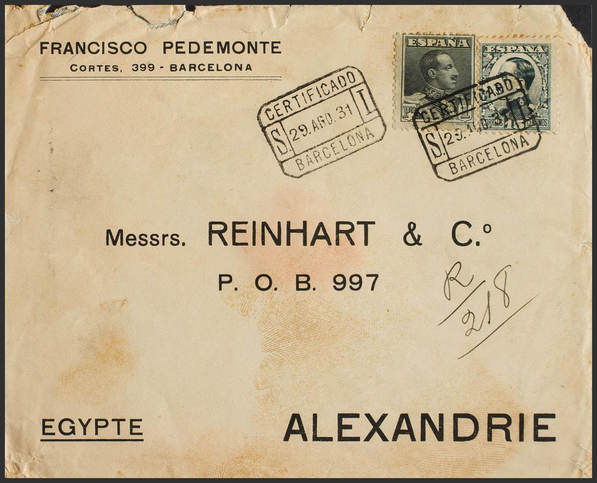 493, 321. 1931. 15 cts gris azul y 1 pts pizarra (Vaquer). Certificado de BARCELONA a ALEJANDRIA (EGIPTO). Al dorso llegada. MAGNIFICA E INUSUAL FRANQUEO.