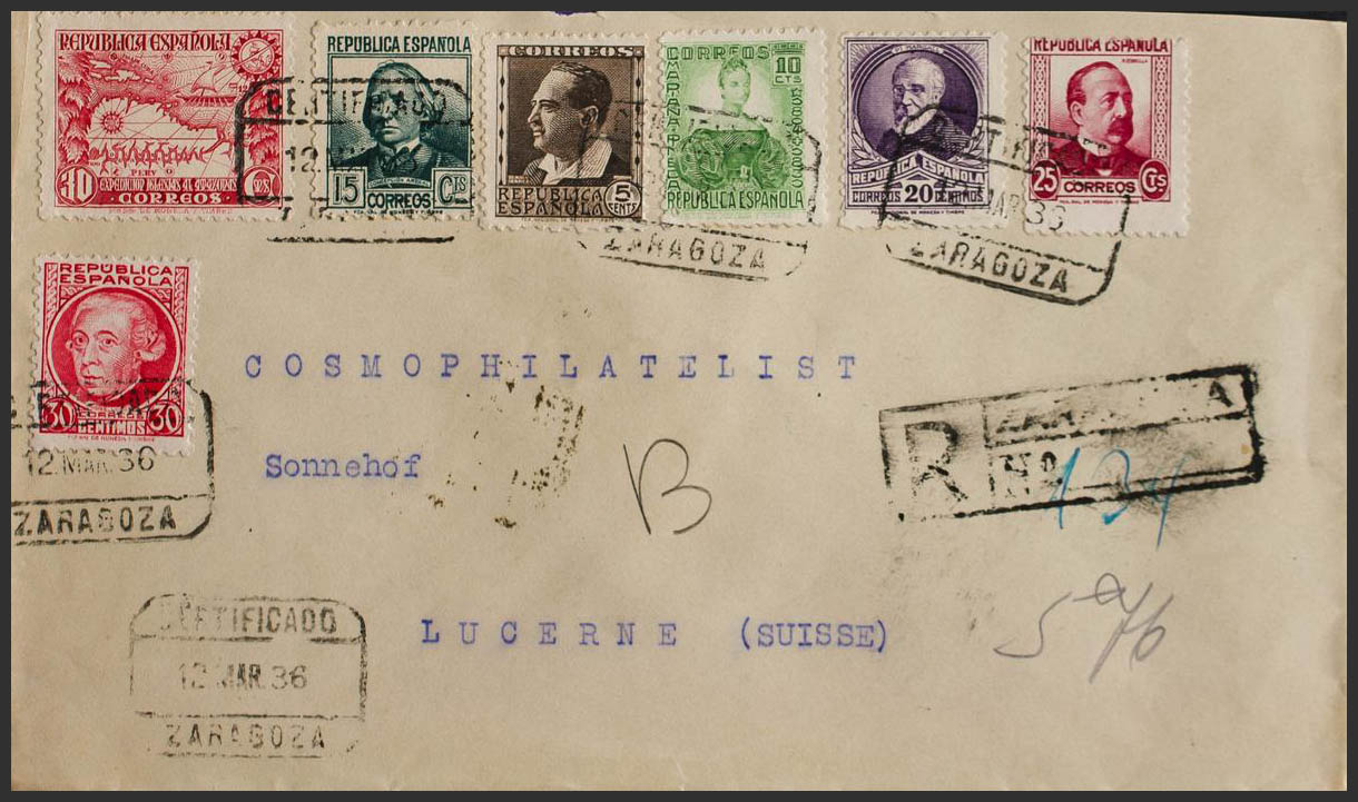 694, 681/85, 687. 1936. 30 cts carmÃn y diversos valores. Certificado de ZARAGOZA a LUCERNA (SUIZA). Al dorso llegada. MAGNIFICA.