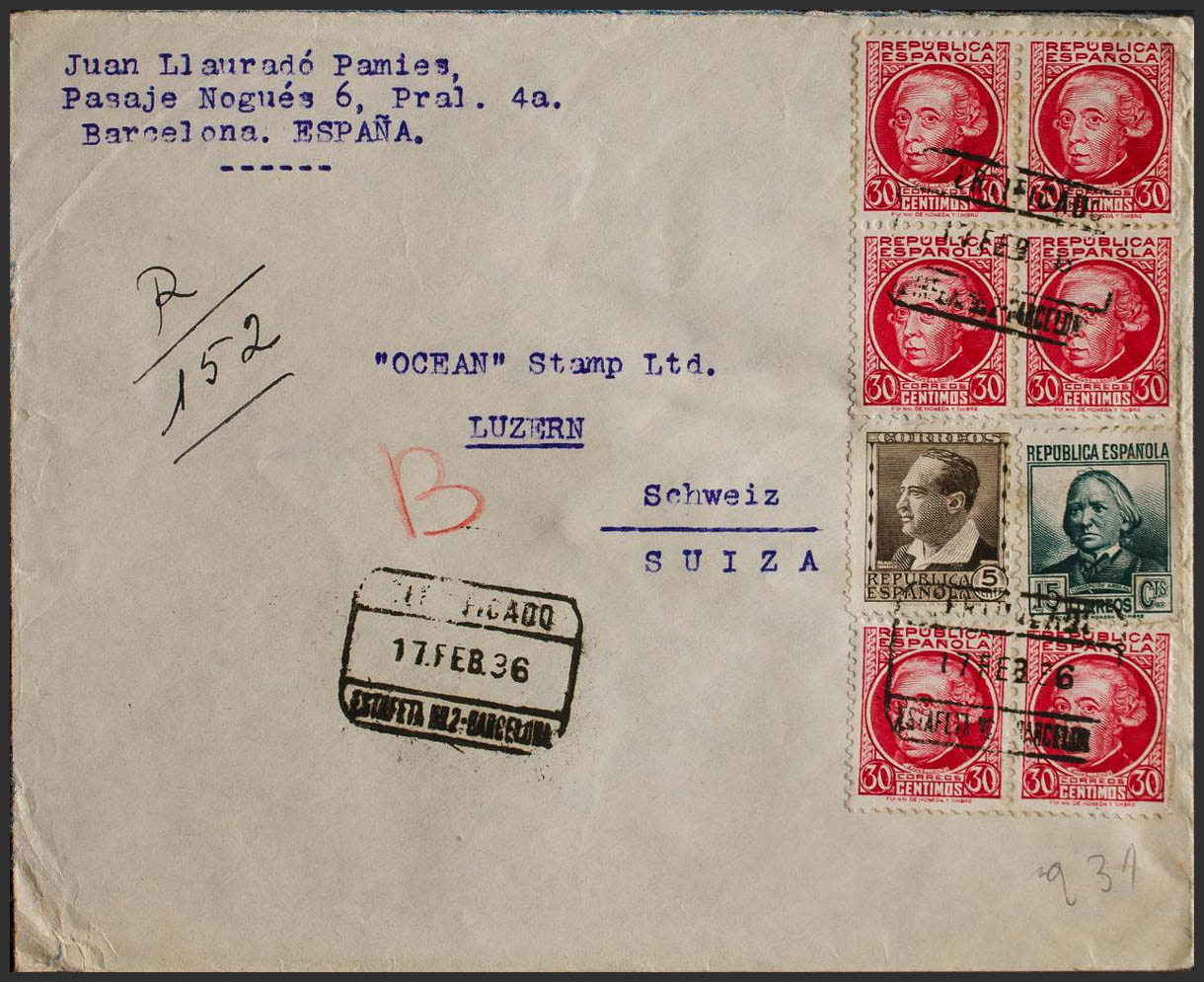 681, 683, 687(6). 1936. 5 cts, 15 cts y 30 cts carmín, seis sellos. Certificado de BARCELONA a LUCERNA (SUIZA). Matasello CERTIFICADO / ESTAFETA Nº2-BARCELONA, al dorso llegada. MAGNIFICA.