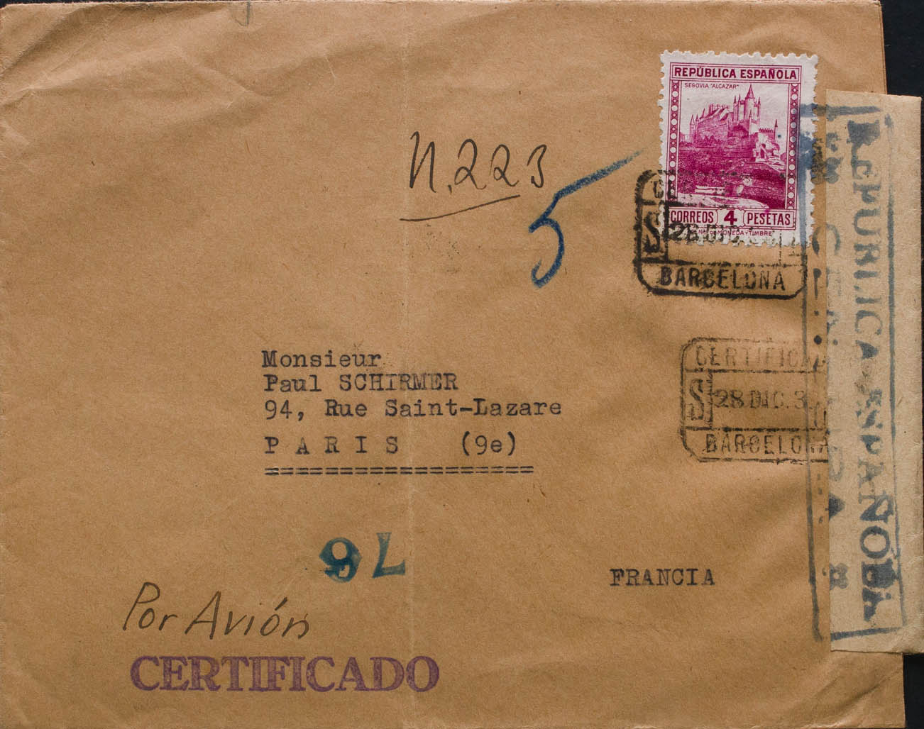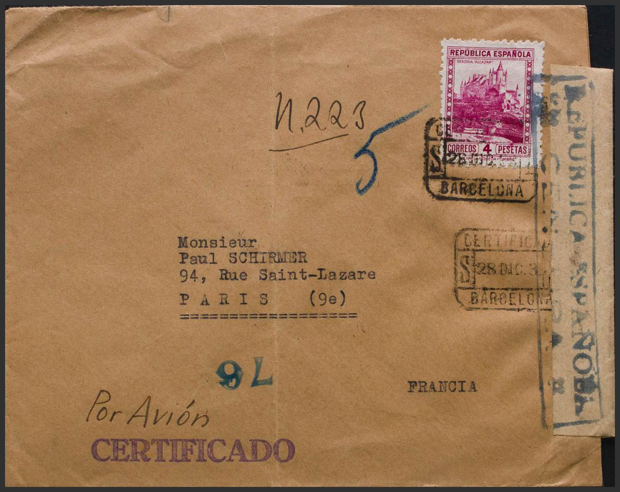 771. 1938. 4 pts lila rosa. BARCELONA a FRANCIA. Al dorso llegada. MAGNIFICA Y RARO FRANQUEO.