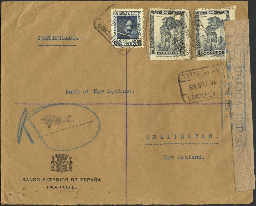 738, 770(2). 1938. 50 cts. y 1 pts., dos sellos. PALAFRUGELL a WELLINGTON (NUEVA ZELANDA). Matasello CERTIFICADO / PALAFRUGELL, en el frente marca REPUBLICA ESPAÑOLA / CENSURA. MAGNIFICA.