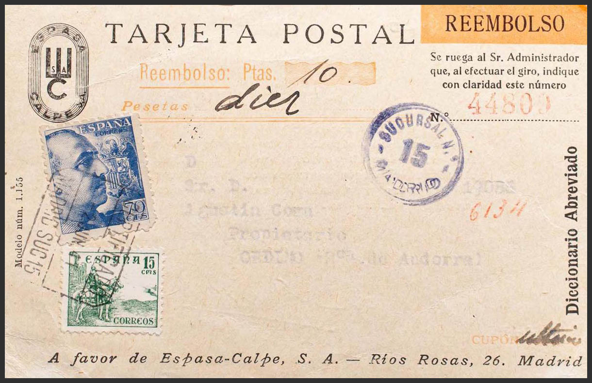 República Española Correo Certificado. Tarjeta Reembolso dirigida a ORDINO (ANDORRA) y devuelta a MADRID. MAGNIFICA.