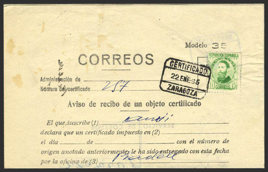 República Española Correo Certificado. Carta aviso. RARA.
