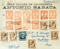 681(6), 688, 678(10). 1935. 5 cts castaño negro, seis sellos, 50 cts azul y 2 cts castaño rojizo, diez sellos. Certificado de BARCELONA a WINTERTHUR (SUIZA). Al dorso llegada. MAGNIFICA E INUSUAL FRANQUEO.