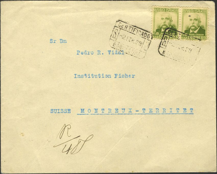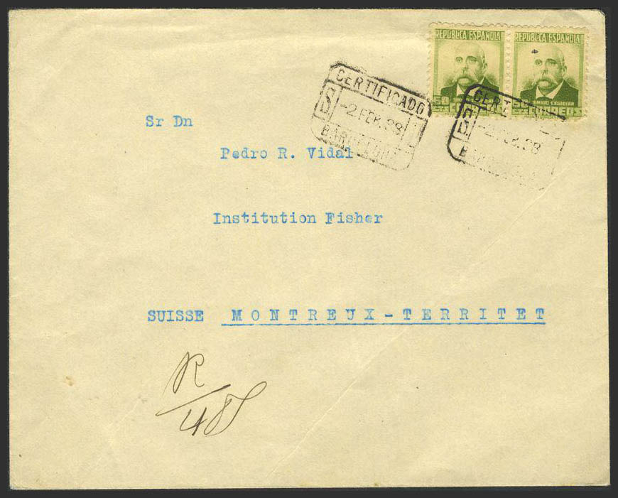 República Española Correo Certificado. Al dorso llegada. MAGNIFICA.