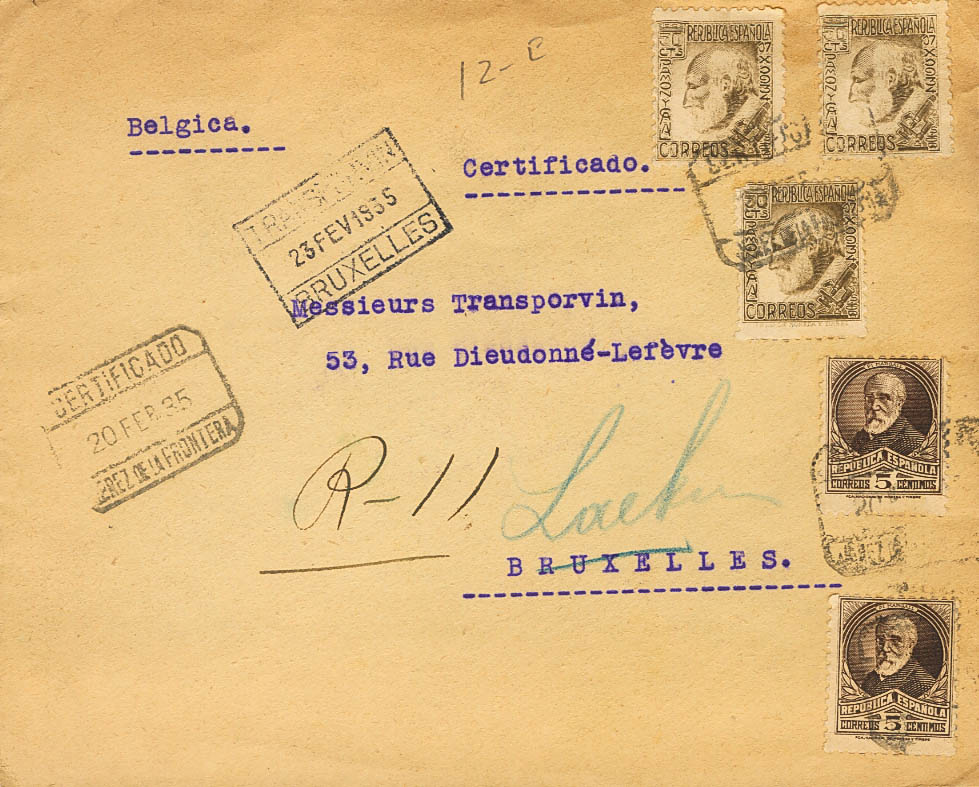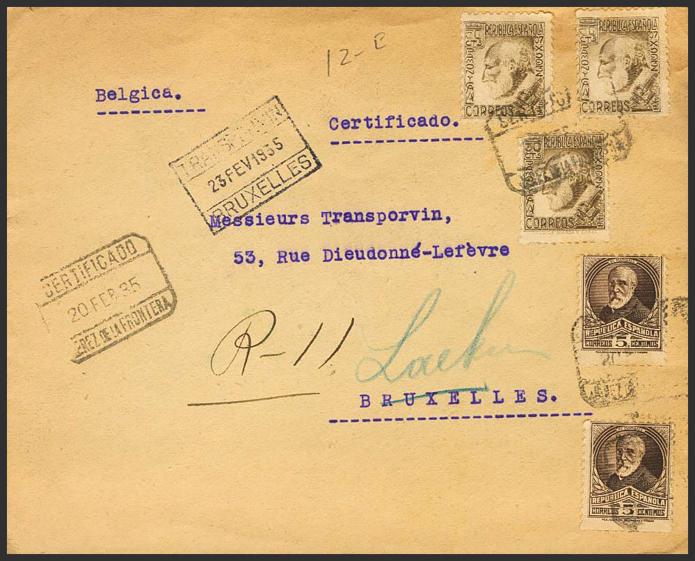 680(3), 663(2). 1935. 30 cts castaño, tres sellos y 5 cts castaño, dos sellos. Certificado de JEREZ DE LA FRONTERA a BRUSELAS (BELGICA). En el frente llegada. MAGNIFICA E INUSUAL FRANQUEO.