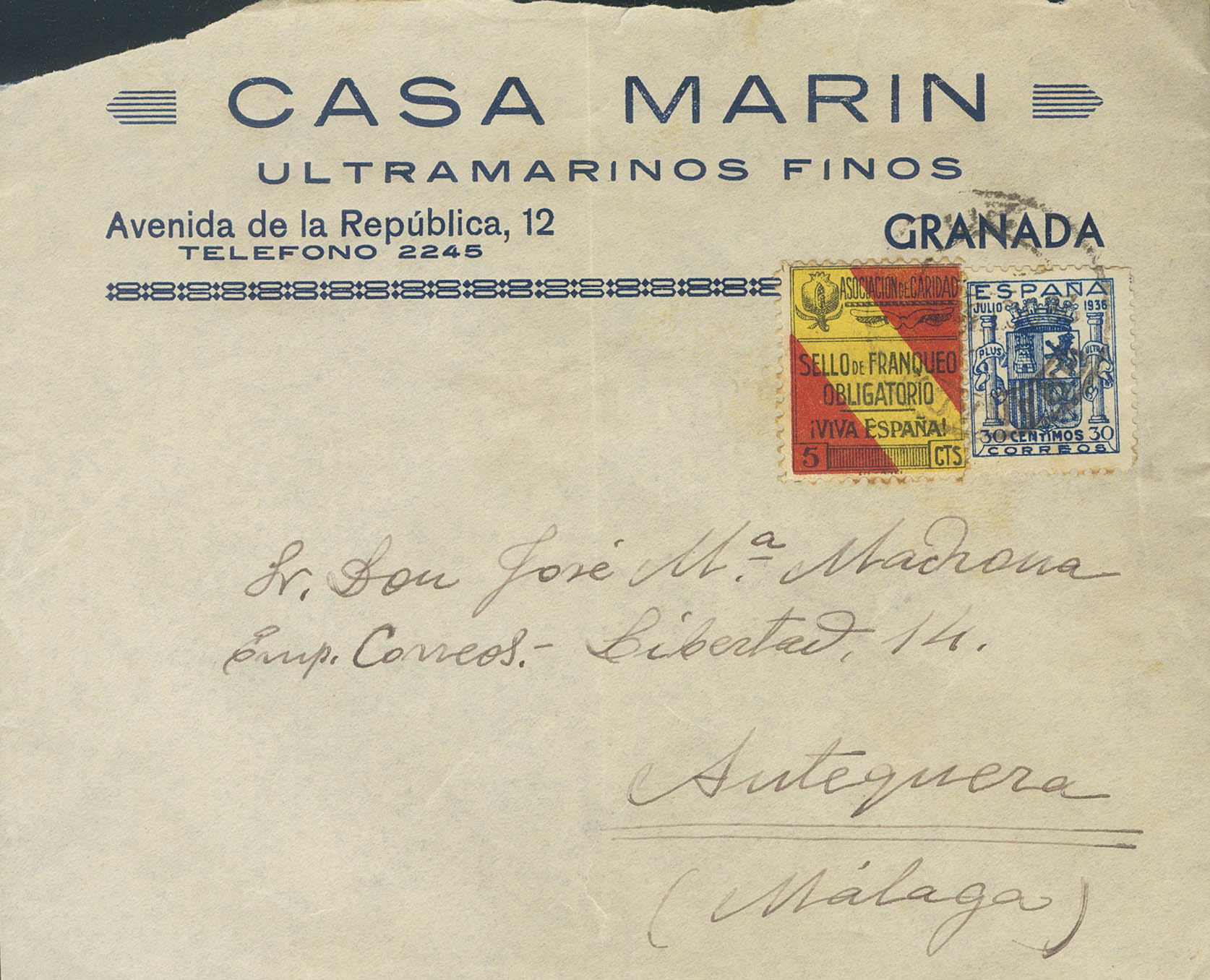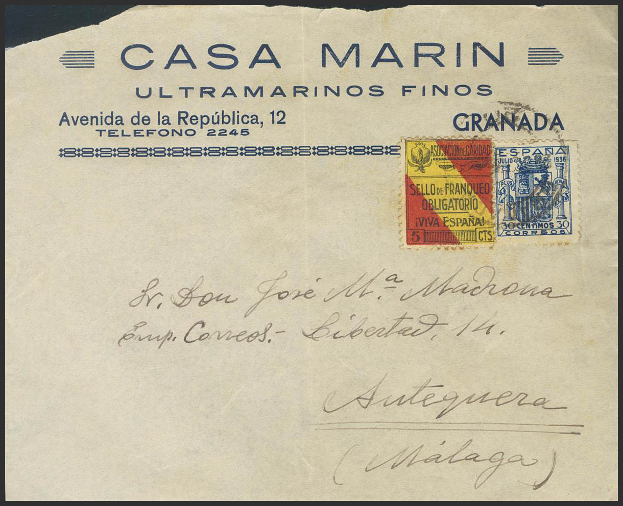801. 1936. 30 cts azul y Benéfico de 5 cts. GRANADA a ANTEQUERA. Al dorso llegada. MAGNIFICA Y MUY RARA Y ESPECTACULAR.