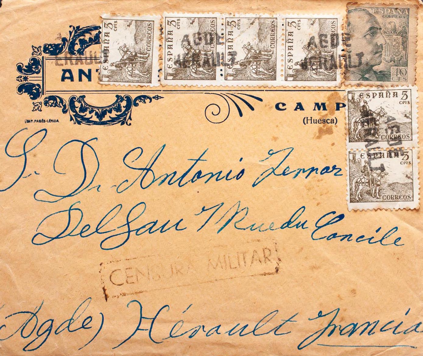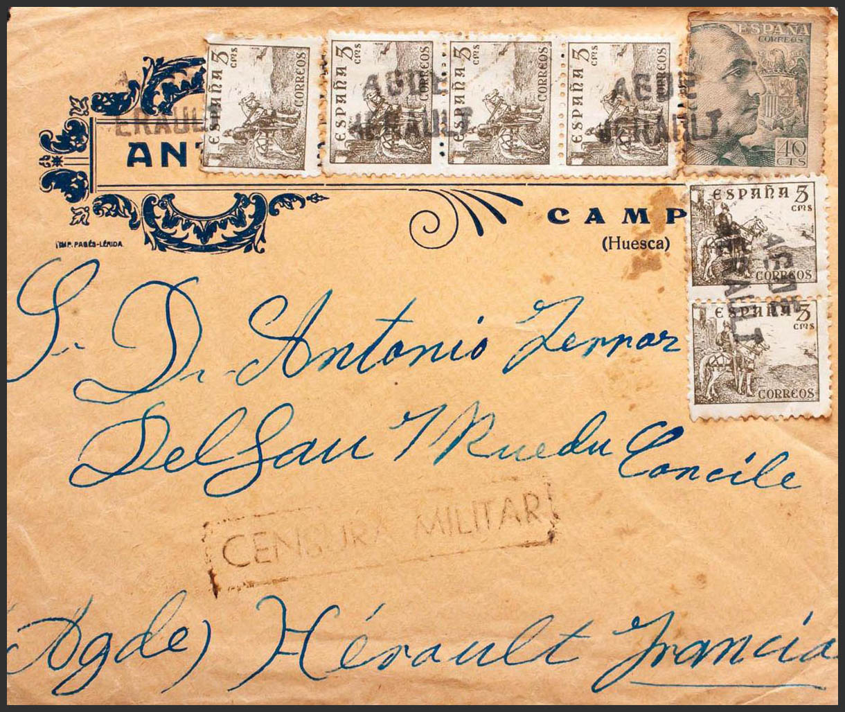 925, 916(6). 1941. 40 cts gris verdoso y 5 cts sepia, seis sellos. CAMPO (HUESCA) a AGDE (FRANCIA). Matasello AGDE / HERAULT, aplicado a la llegada. BONITA E INUSUAL.