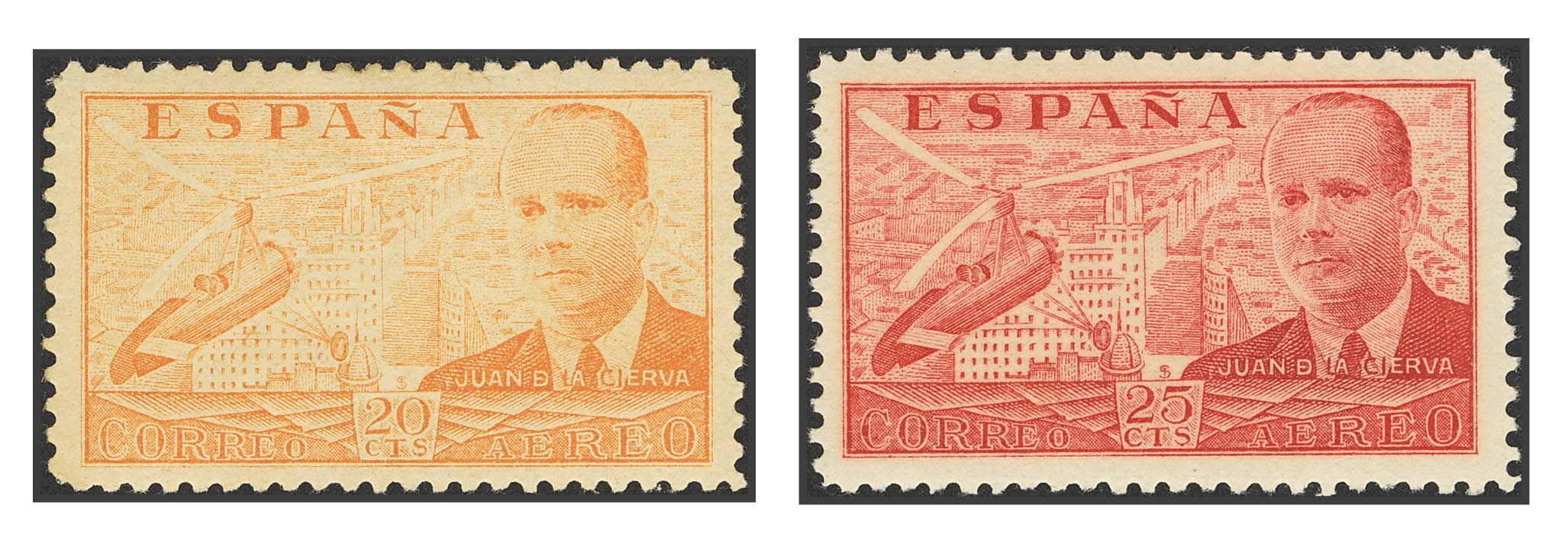 ★ 880ec, 881ec. 1939. Conjunto de dos variedades de color enormemente acusadas, el 20 cts amarillo (en lugar de naranja) y el 25 cts rosa-bermellón (en lugar de rojo). MAGNIFICOS Y RARISIMOS, NO CATALOGADOS, ES LA PRIMERA VEZ QUE IBERPHIL LOS OFRECE. Cert. COMEX.
