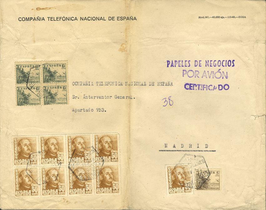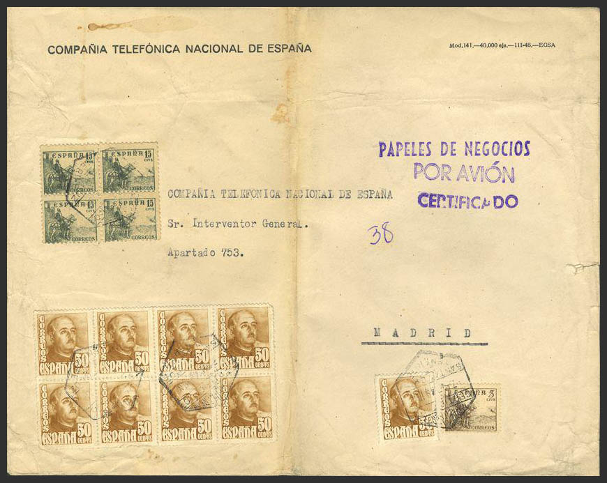 1022(9), 1044, 1046(4). 1949. 5 cts, 15 cts, bloque de cuatro y 50 cts, nueve sellos. Certificado de SANTA CRUZ DE TENERIFE a MADRID. Al dorso llegada. MAGNIFICA.