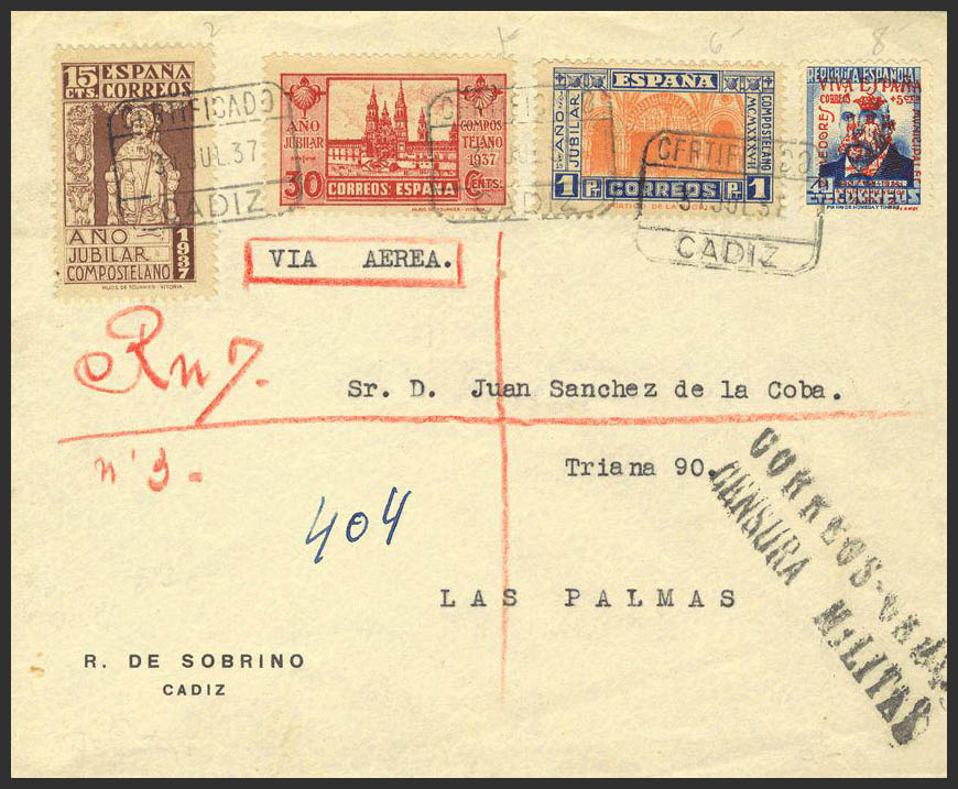 833/35. 1937. Serie completa. Certificado de CADIZ a LAS PALMAS. Al dorso llegada. MAGNIFICA Y RARA.
