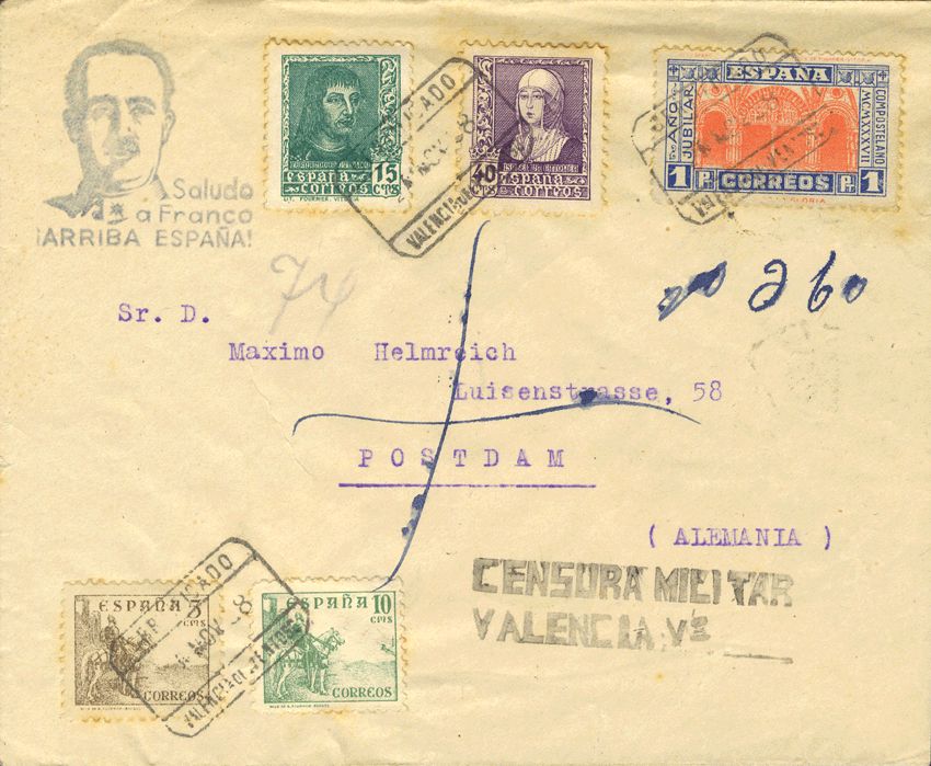 835. 1938. 5 cts, 10 cts, 15 cts, 40 cts, 1 pts y 5 cts, dos sellos locales BADAJOZ. Certificado de VALENCIA DEL VENTOSO a POSTDAM. Al dorso llegada. MAGNIFICA.